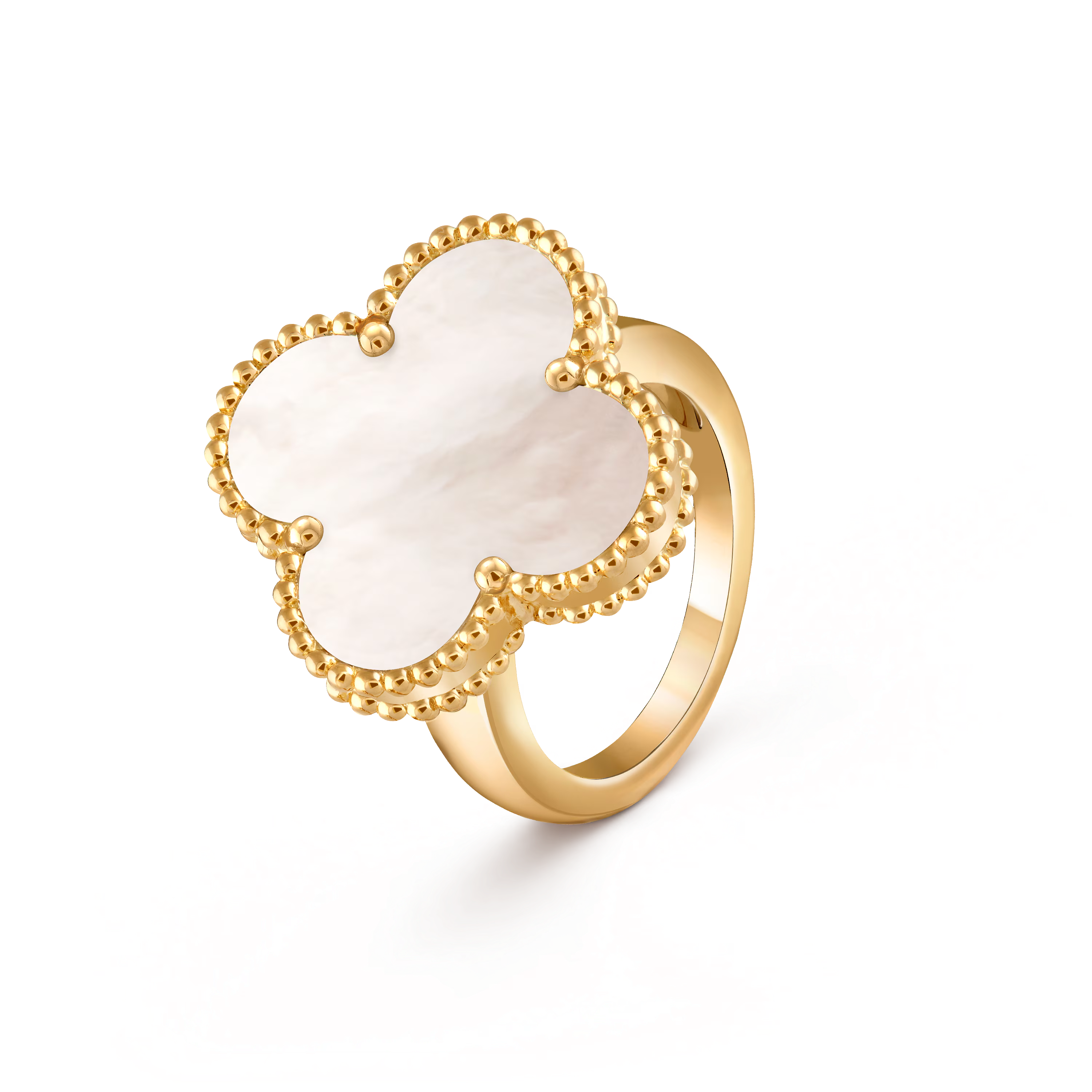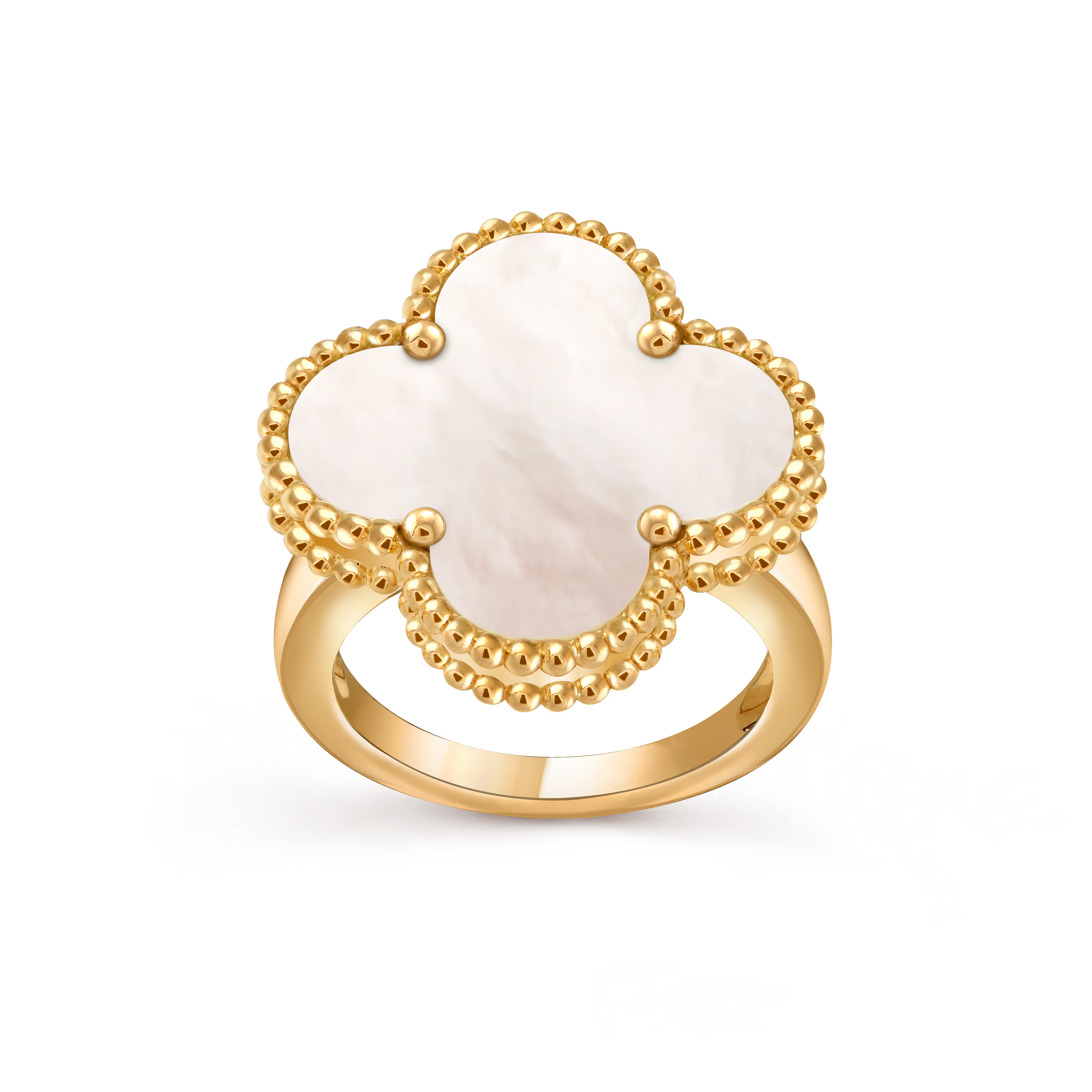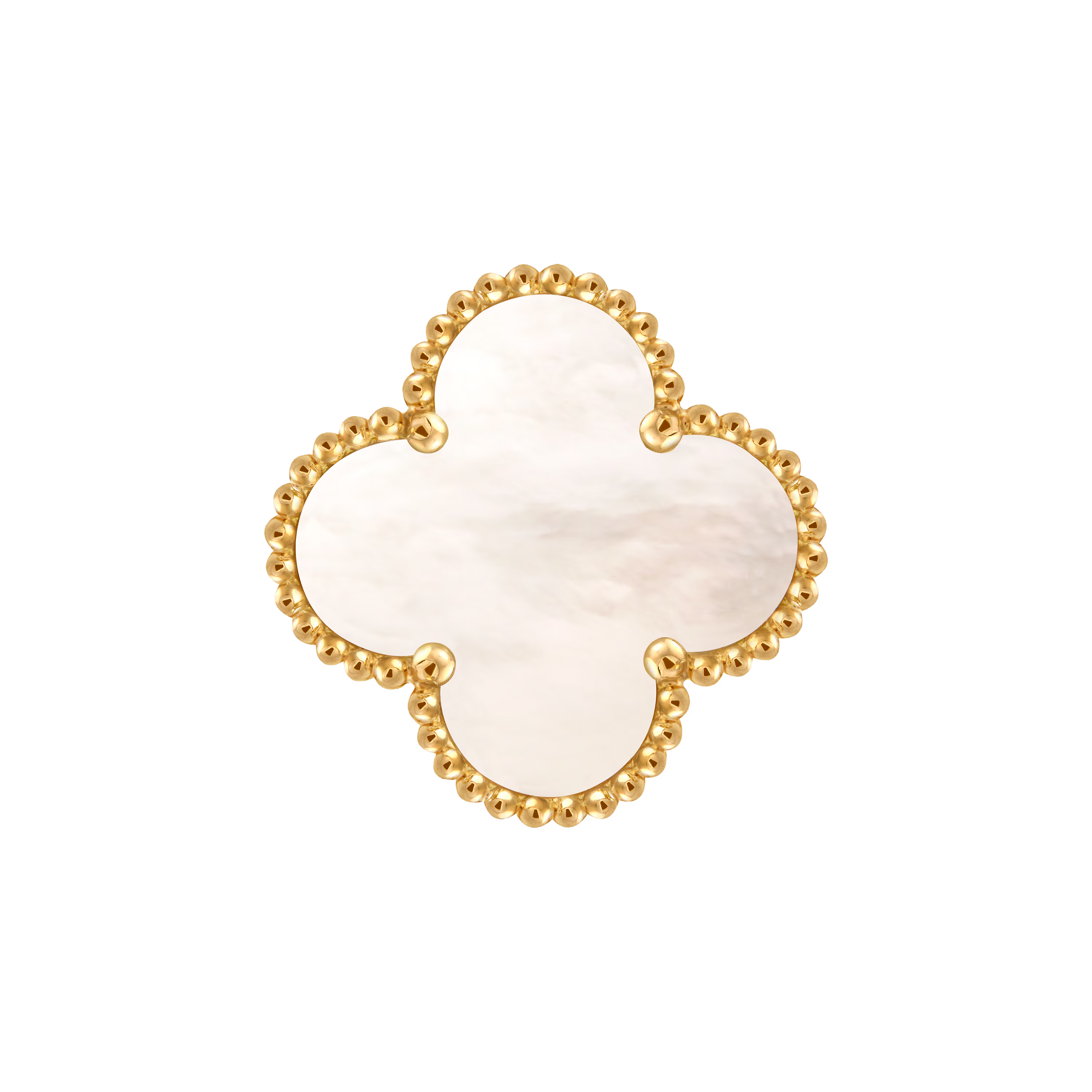 En son centre, un motif en nacre dévoile une lumière douce et irisée. Sa surface chatoyante évolue subtilement au fil des mouvements, faisant écho à la beauté sereine de l’emblème Alhambra. Le motif est sublimé par le contour perlé en or signature, emblème du savoir-faire minutieux de la Maison.