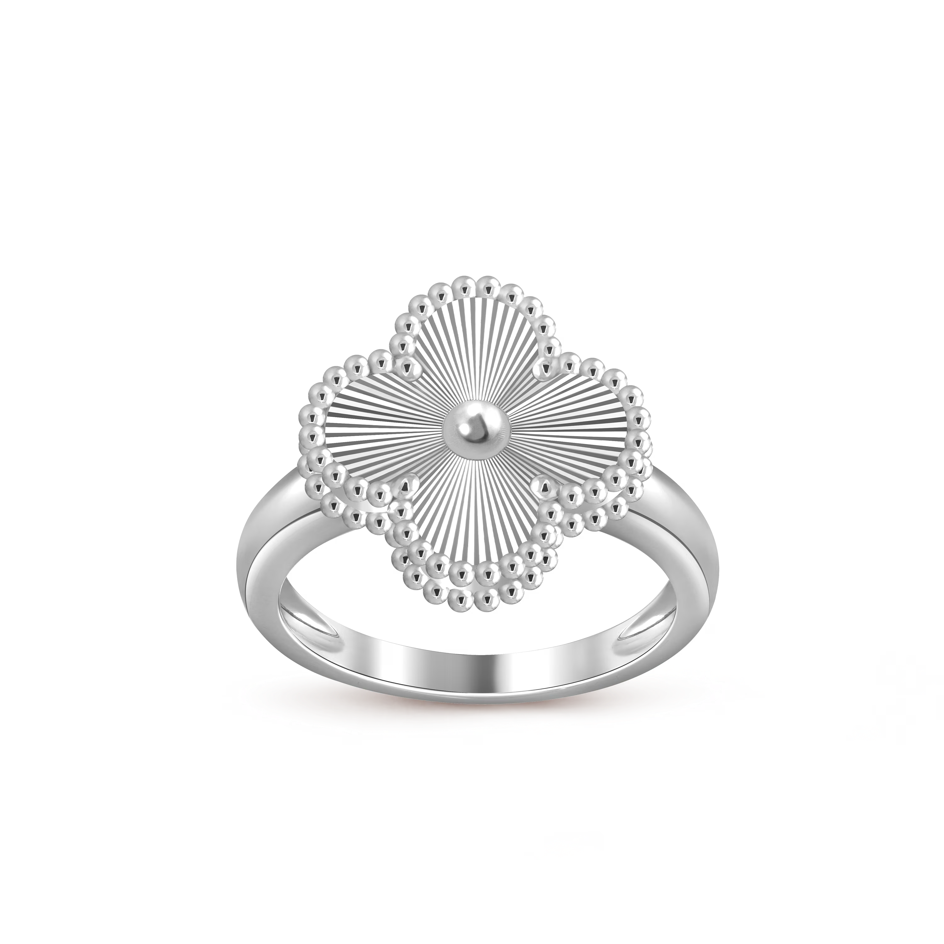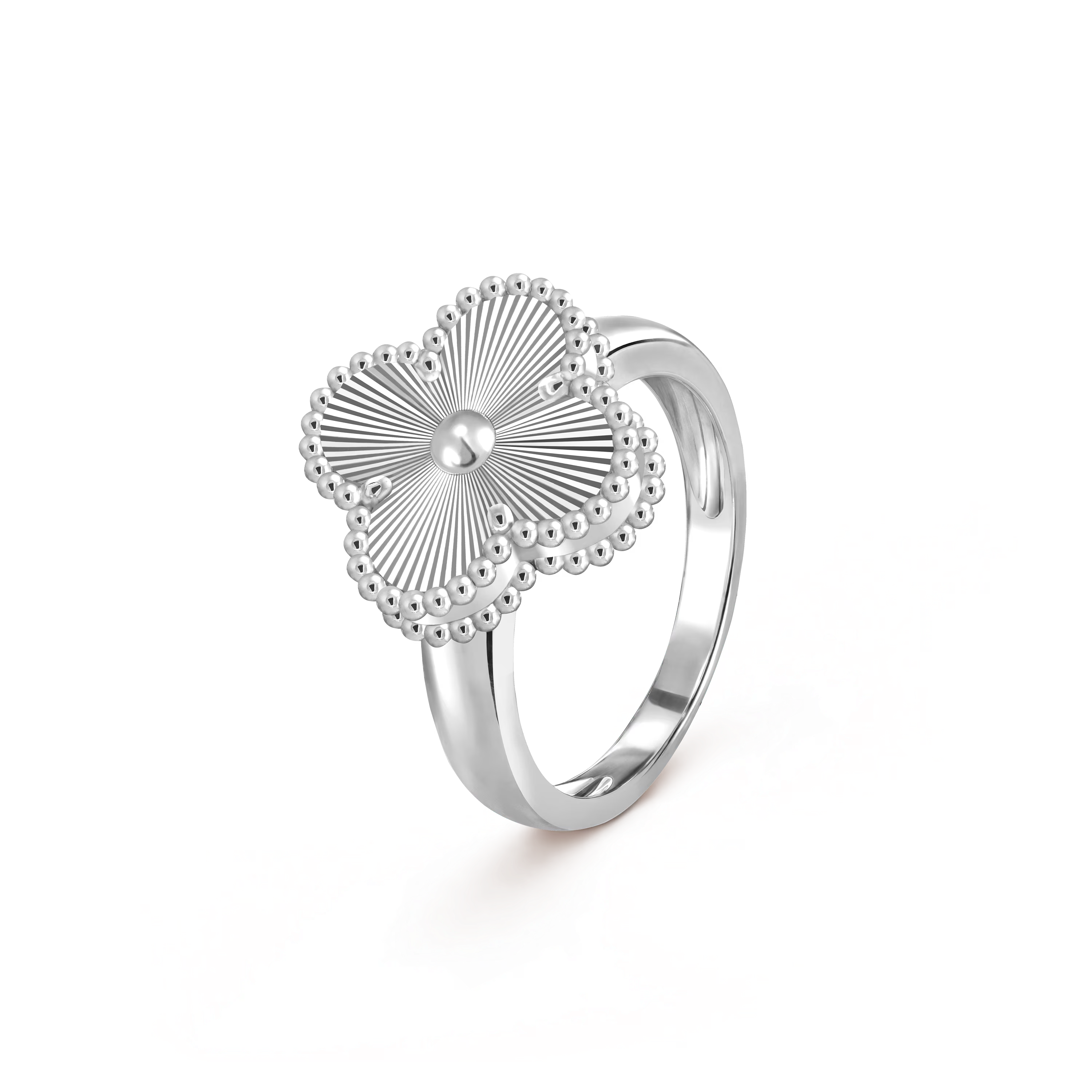 Réalisée en or blanc 18 carats, la bague met en valeur le motif Alhambra classique, sublimé par une finition polie à la main, reflet de l’attention méticuleuse portée aux détails par la Maison. Ses lignes raffinées et son élégance discrète en font une pièce idéale aussi bien pour le quotidien que pour les occasions particulières.