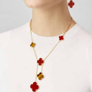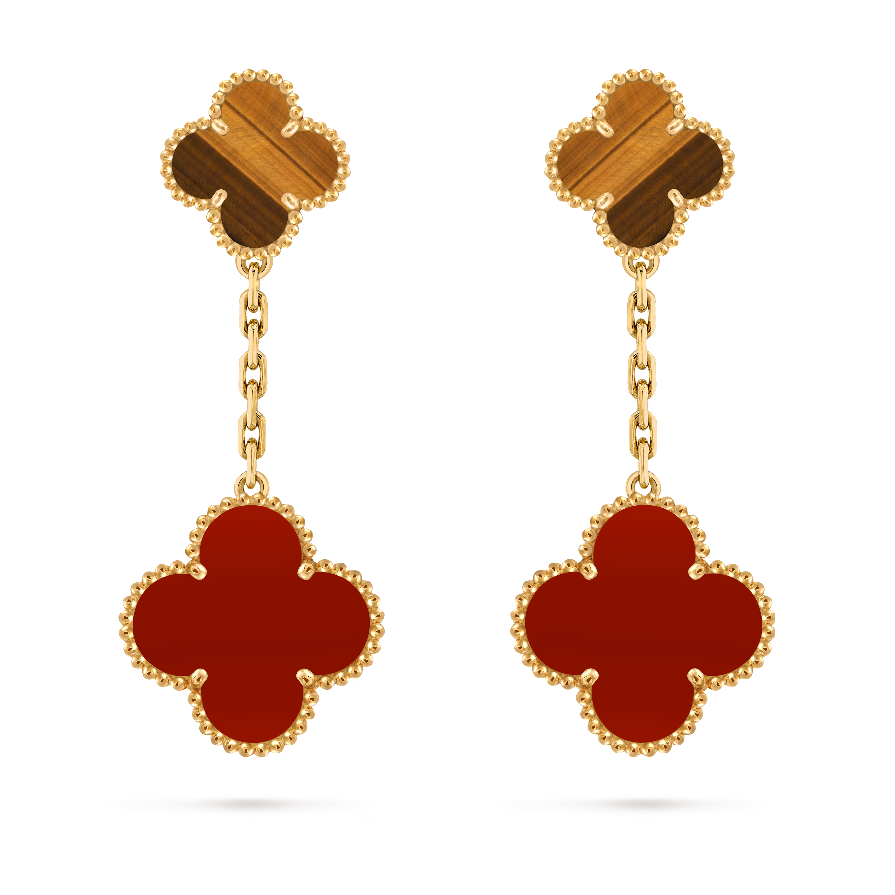 Réalisés en or 18 carats lumineux, chaque motif est orné de pierres naturelles soigneusement sélectionnées pour leur pureté, leur profondeur et leur éclat — telles que la nacre irisée, l’onyx profond ou la cornaline chaude, selon la variation. Le contour en or granité, signature de la Maison et minutieusement poli à la main, encadre chaque motif tel un halo délicat, reflétant le savoir-faire inégalé de Van Cleef & Arpels.