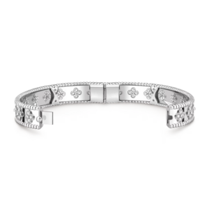 Ce bracelet présente de grands motifs de trèfle Perlée, offrant une présence audacieuse mais harmonieuse au poignet. L’échelle généreuse renforce la qualité sculpturale de chaque motif, faisant du bracelet une pièce maîtresse tout en conservant son équilibre gracieux.