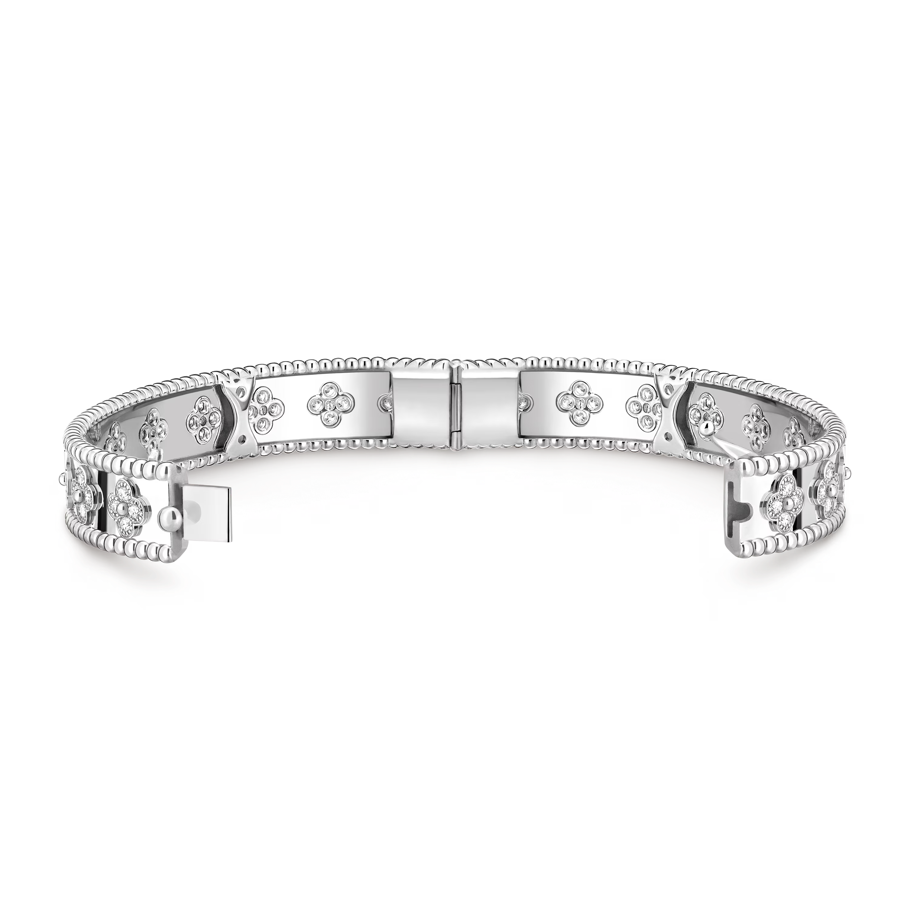 Radieux et expressif, le bracelet Trèfles Perlée incarne une interprétation joyeuse de la chance et de l’élégance, célébrant le mouvement, la lumière et la beauté durable dans une forme contemporaine.