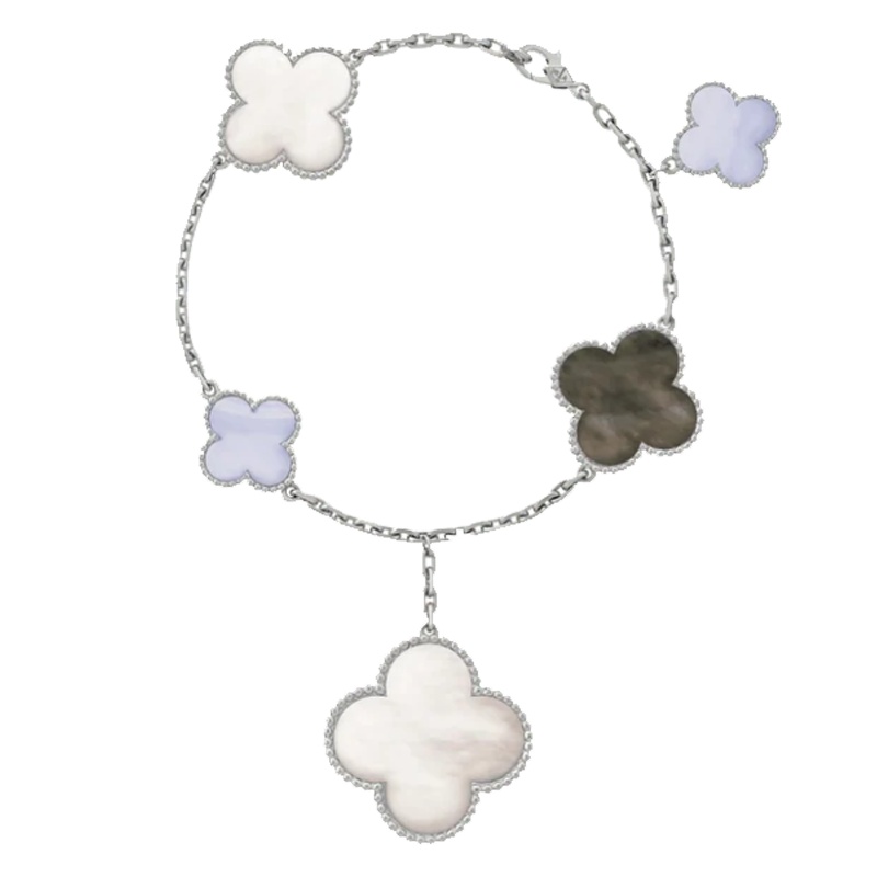 Le bracelet Magic Alhambra réinterprète le motif quatre feuilles emblématique de la Maison à travers un jeu harmonieux de tailles contrastées. Avec cinq motifs disposés dans une élégante séquence asymétrique, la pièce exprime liberté, mouvement et imagination raffinée.