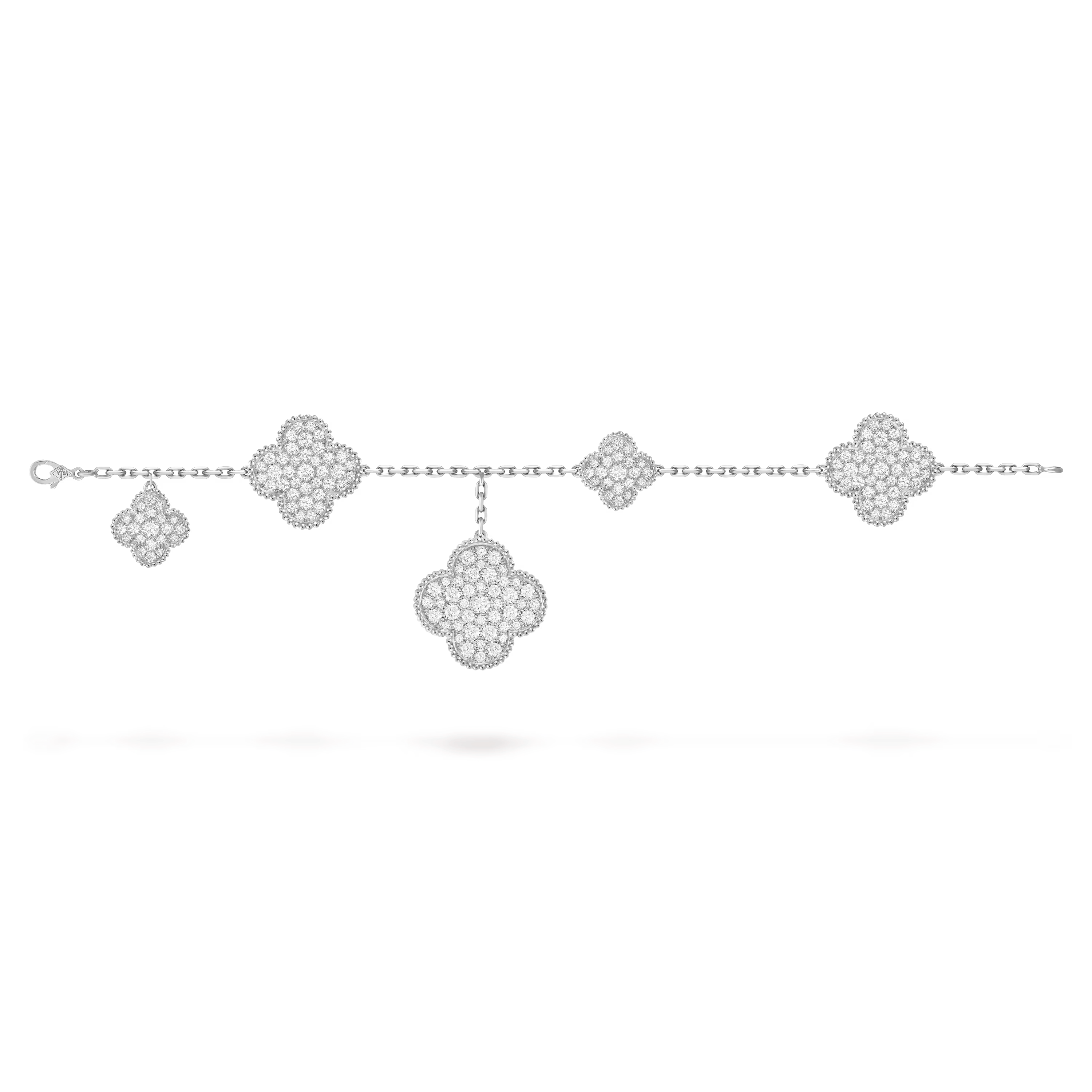 La collection Magic Alhambra propose une réinterprétation poétique du motif quatre-feuilles signature de la Maison. En combinant des motifs de tailles variées, ce bracelet à cinq motifs capture un sentiment de mouvement, d’harmonie et de beauté imaginative.