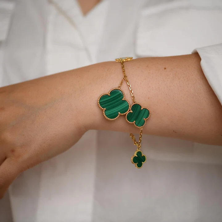 Chaque motif est réalisé dans une taille distincte, créant un équilibre gracieux entre délicatesse et présence. Cette variation apporte un rythme visuel au bracelet, permettant à chaque motif de briller de manière unique.