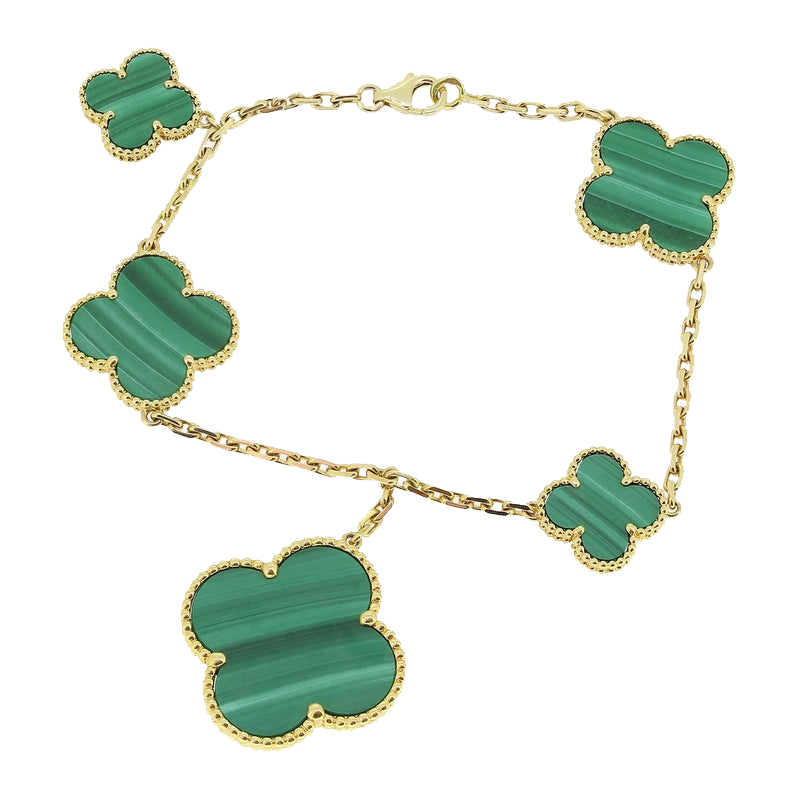 Le bracelet Magic Alhambra réinterprète le motif quatre feuilles emblématique de la Maison à travers un jeu harmonieux de tailles contrastées. Avec cinq motifs disposés dans une élégante séquence asymétrique, cette pièce exprime liberté, mouvement et imagination raffinée.