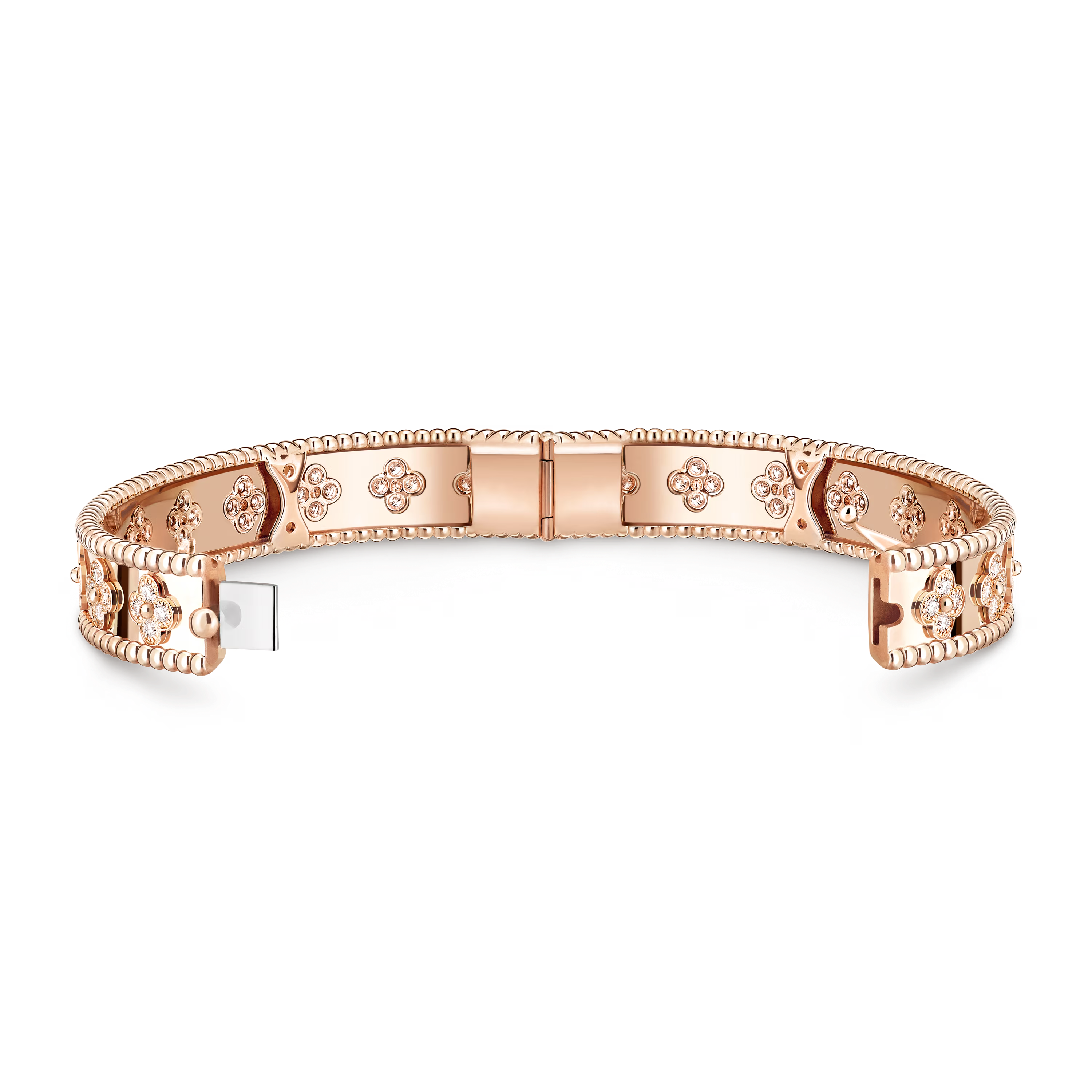 Chaque trèfle est minutieusement réalisé pour révéler des pétales lisses et équilibrés, encadrés par un halo de perles d’or polies. Les contours arrondis ajoutent profondeur et éclat, mettant en valeur la symétrie délicate du motif et conférant au bracelet une luminosité joueuse.