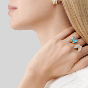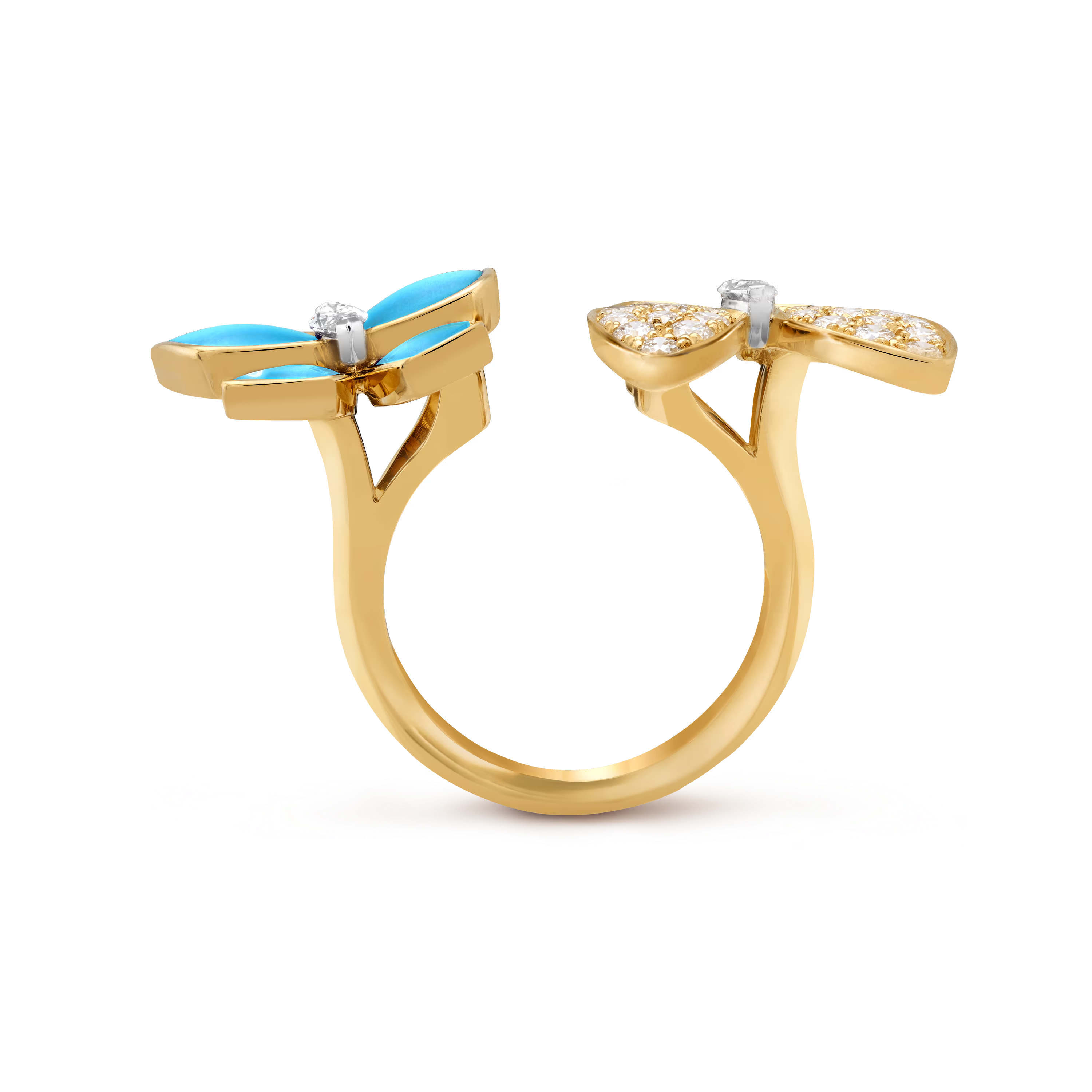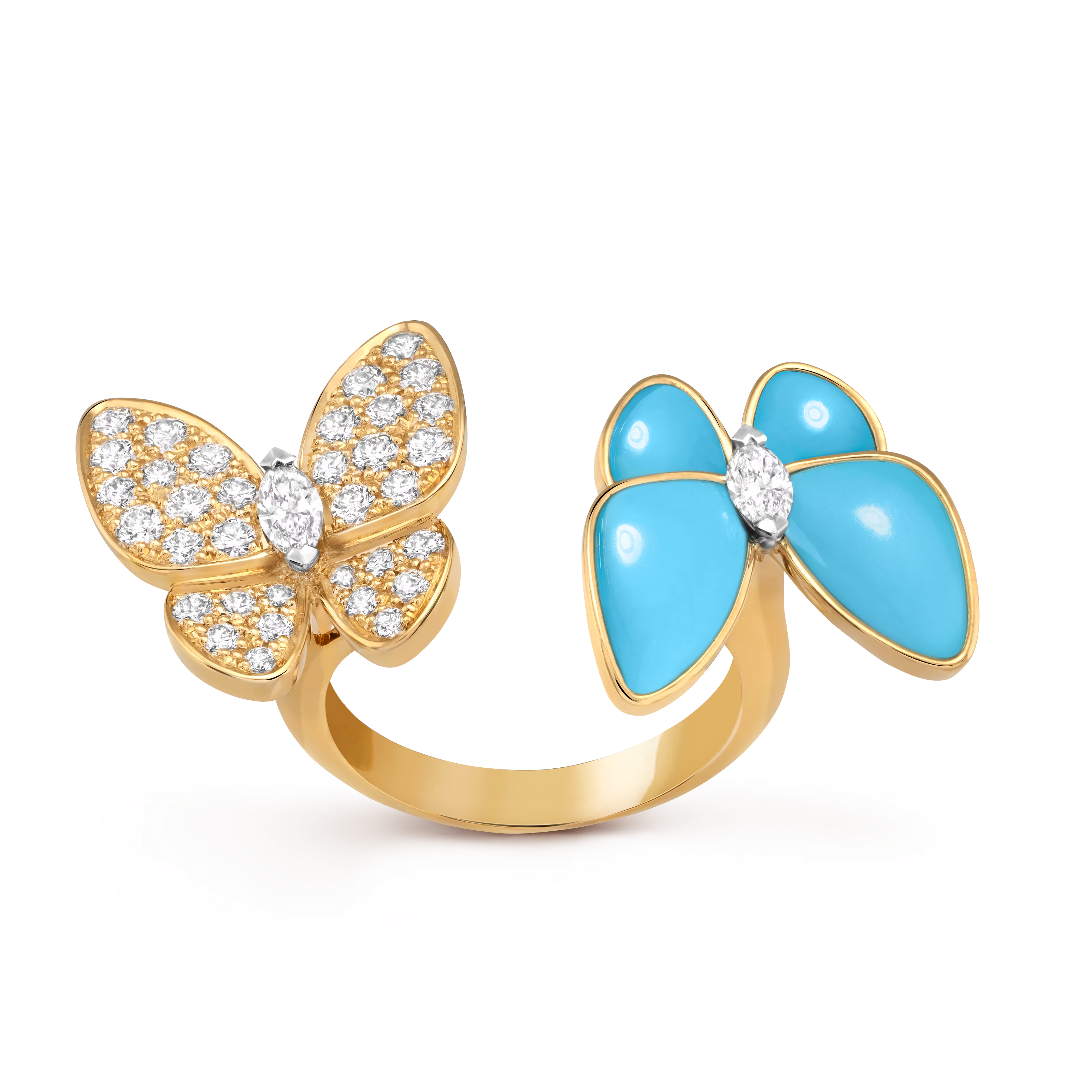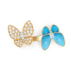 Un papillon est orné de turquoise vive, dont la teinte bleue intense évoque des ciels clairs et des horizons sereins. Lisse et lumineuse, la beauté naturelle de la pierre offre un contraste joyeux avec la chaleur de l’or. Le second papillon scintille de diamants brillants, minutieusement sertis pour suivre les délicates ailes et capturer la lumière à chaque mouvement.