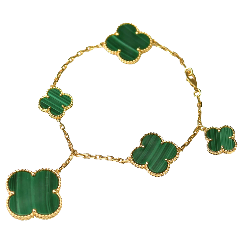 Élégant et porteur de sens, le bracelet Magic Alhambra Malachite à 5 motifs incarne une vision poétique de la joaillerie — où la nature, la chance et le design intemporel se rejoignent pour créer un symbole durable de luxe raffiné.