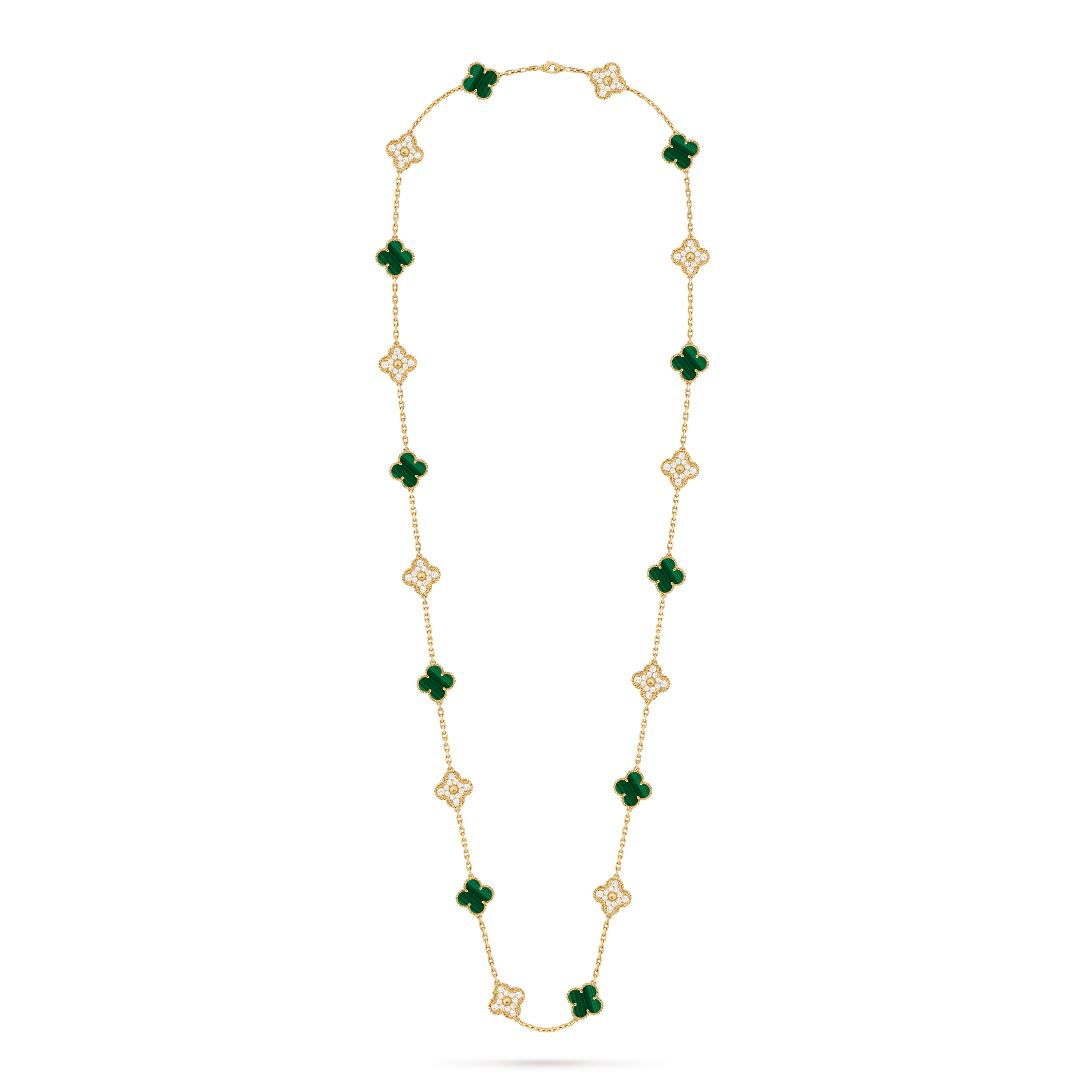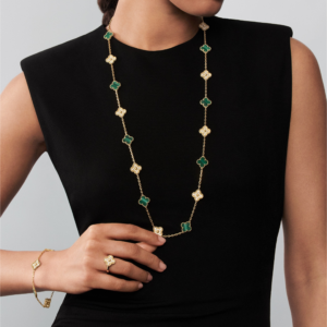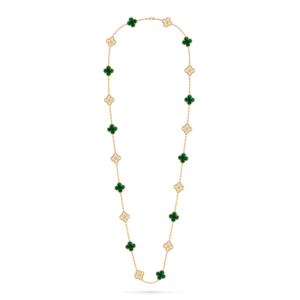 Le design long à vingt motifs tombe avec grâce et offre une polyvalence exceptionnelle : il peut être porté en une seule rangée dramatique, doublé pour un effet superposé ou associé à d’autres créations Alhambra pour un ensemble emblématique. Radieux, significatif et magistralement travaillé, il incarne la vision poétique de la Maison : joie et élégance.
