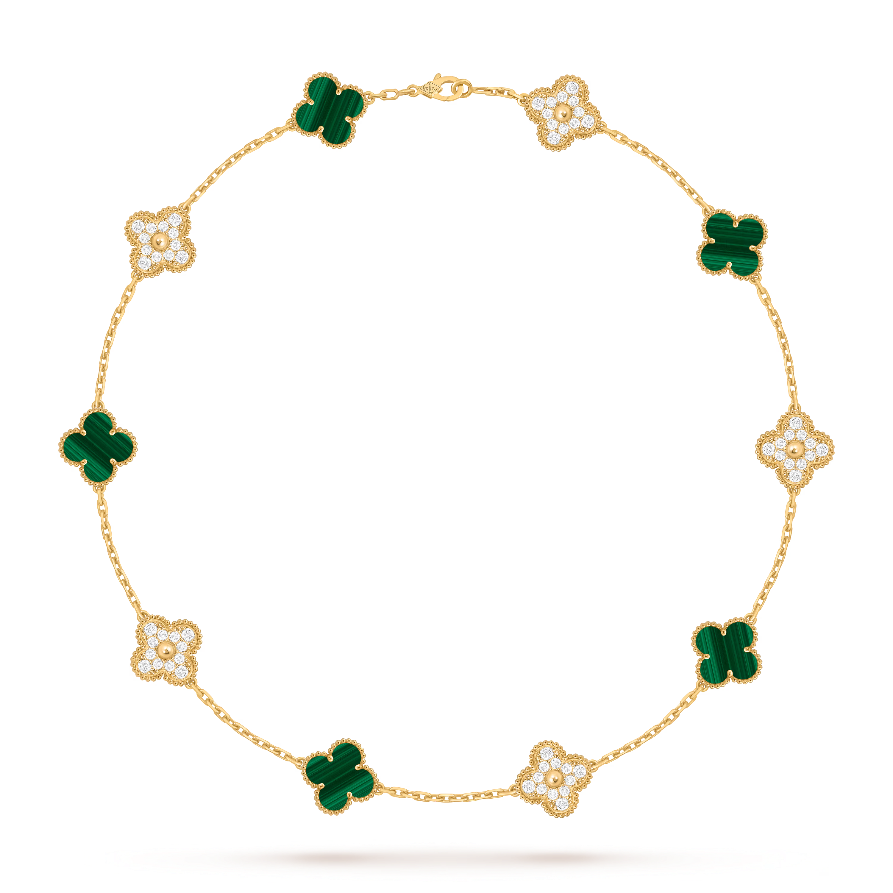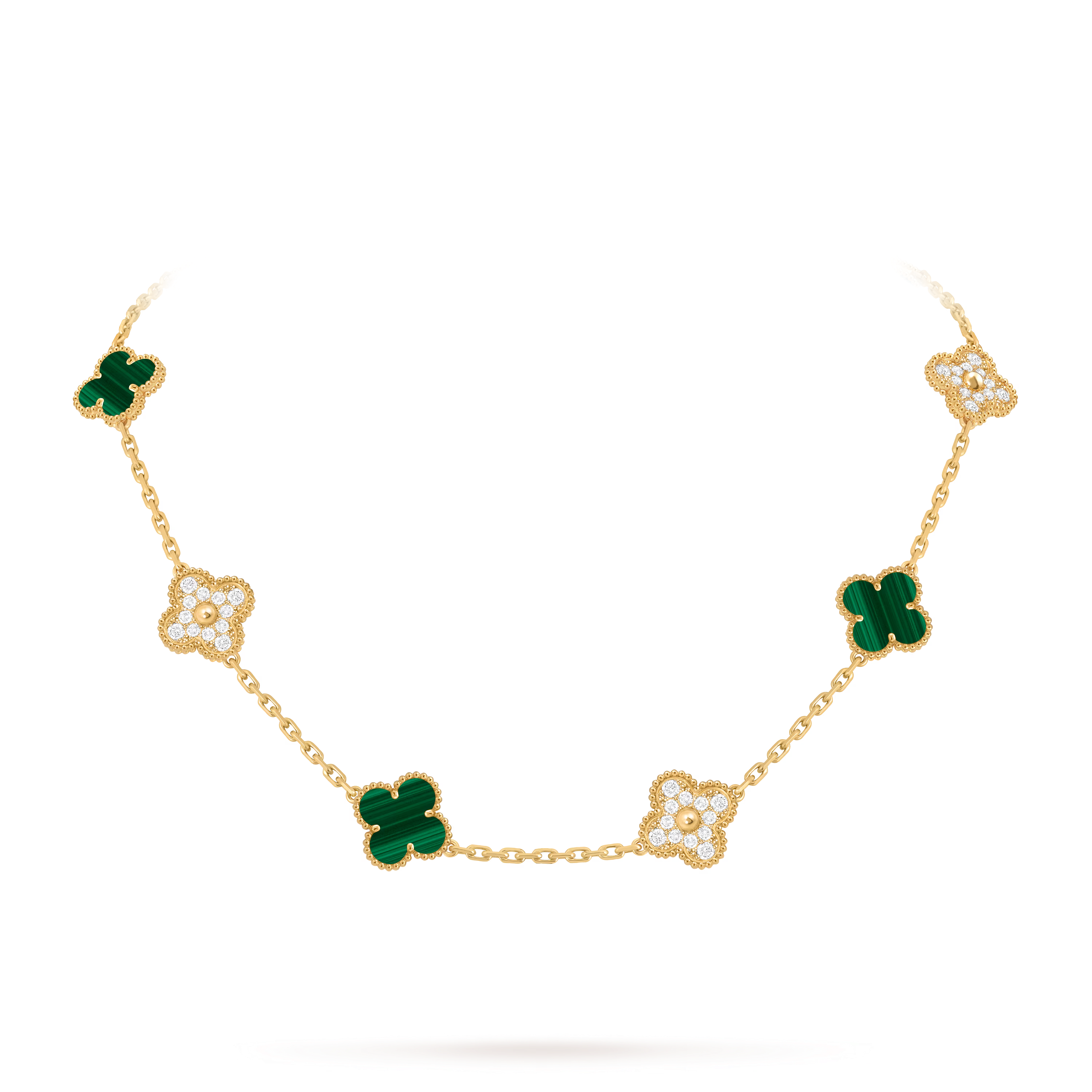 La malachite naturelle révèle des tons de vert profond aux veinures distinctives, offrant un contraste captivant avec l’éclat des diamants soigneusement sertis. Encadré par le contour perlée signature en or, chaque motif réfléchit la lumière avec une radiance subtile, créant un collier à la fois lumineux et intemporel.