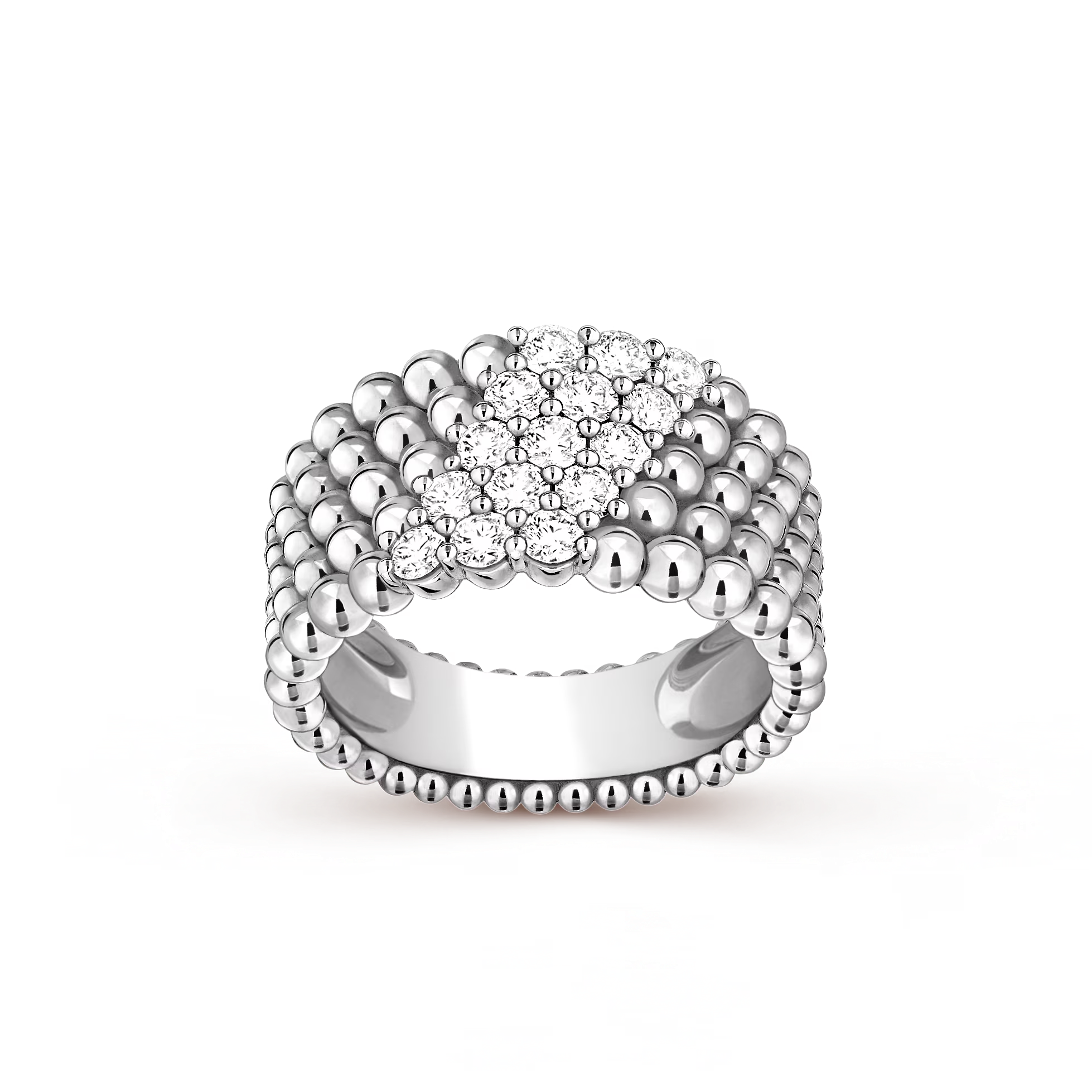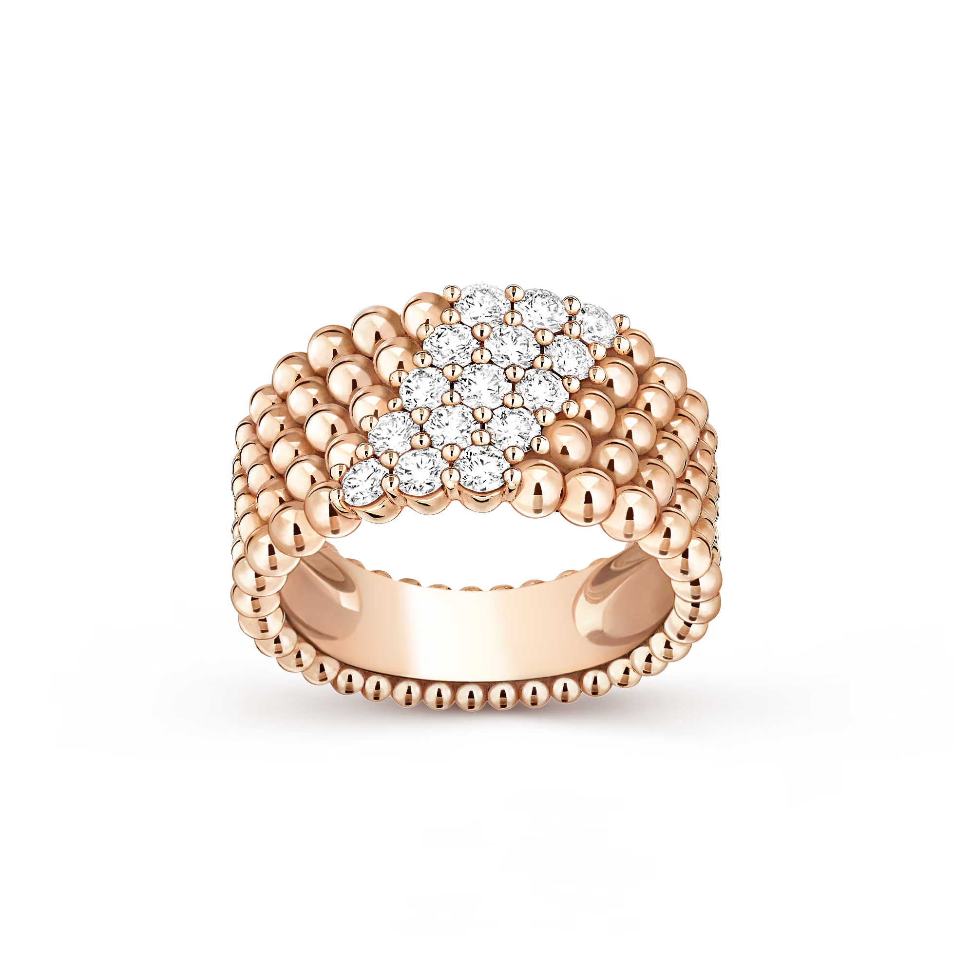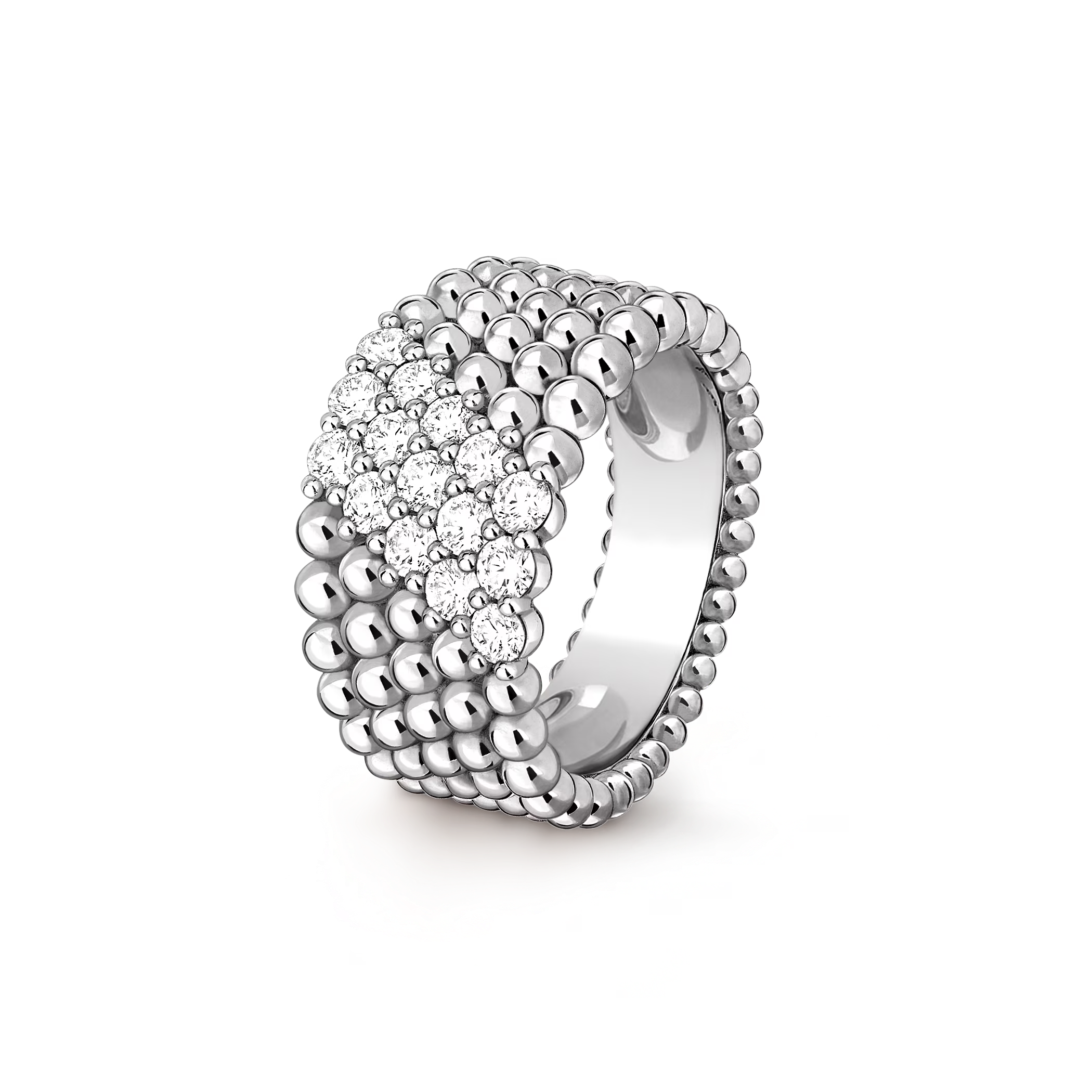 Véritable célébration de la lumière et du savoir-faire, la bague Perlée Diamonds à cinq rangs dévoile l’expression la plus opulente des perles d’or emblématiques de la Maison. Cette création d’exception illustre la maîtrise de Van Cleef & Arpels dans l’art de conjuguer textures, éclat et harmonie des volumes.