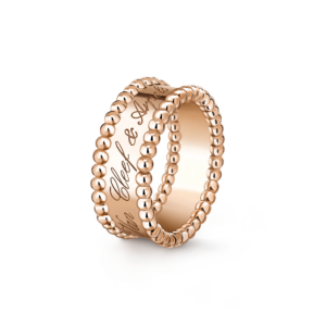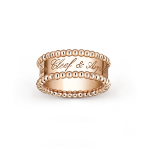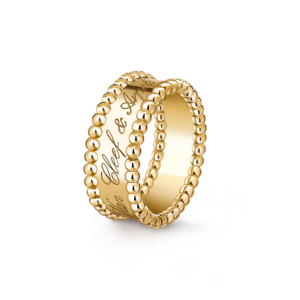 Élégante, joyeuse et résolument iconique, la bague Perlée Signature célèbre le savoir-faire poétique de Van Cleef & Arpels à travers l’esthétique emblématique des perles d’or chères à la Maison. Cette création raffinée se distingue par des rangs de perles polies qui encadrent avec délicatesse la signature gravée de Van Cleef & Arpels, hommage à un artisanat intemporel et à l’héritage de la collection Perlée.