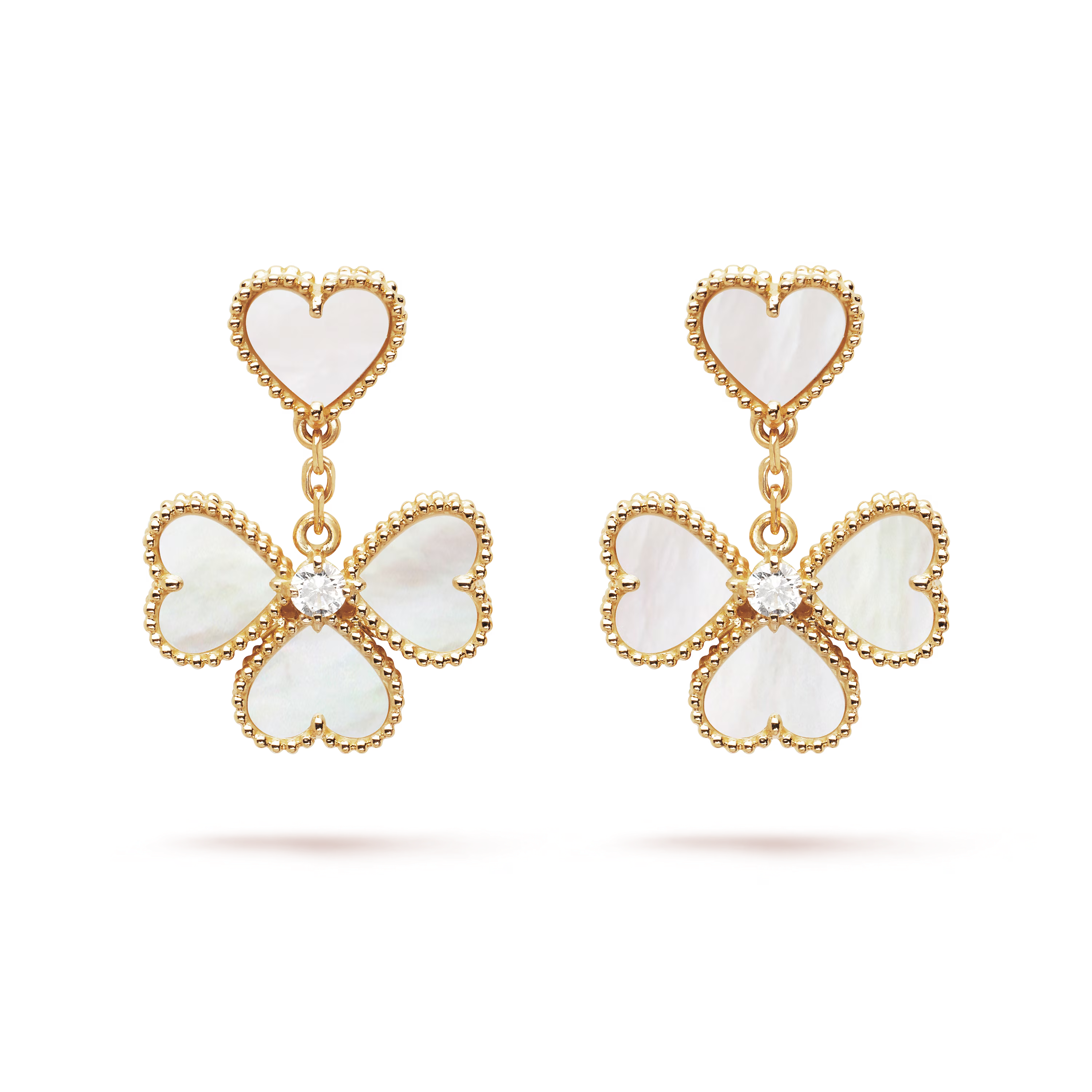 Réalisés en or 18 carats d’exception, chaque cœur est orné de matériaux naturels choisis pour leur éclat remarquable — qu’il s’agisse de nacre lumineuse, de cornaline vibrante ou d’autres pierres raffinées. Les contours perlés emblématiques de la Maison, polis à la main, encadrent chaque motif, apportant une lueur subtile et mettant en valeur le savoir-faire méticuleux qui fait la renommée de Van Cleef & Arpels.