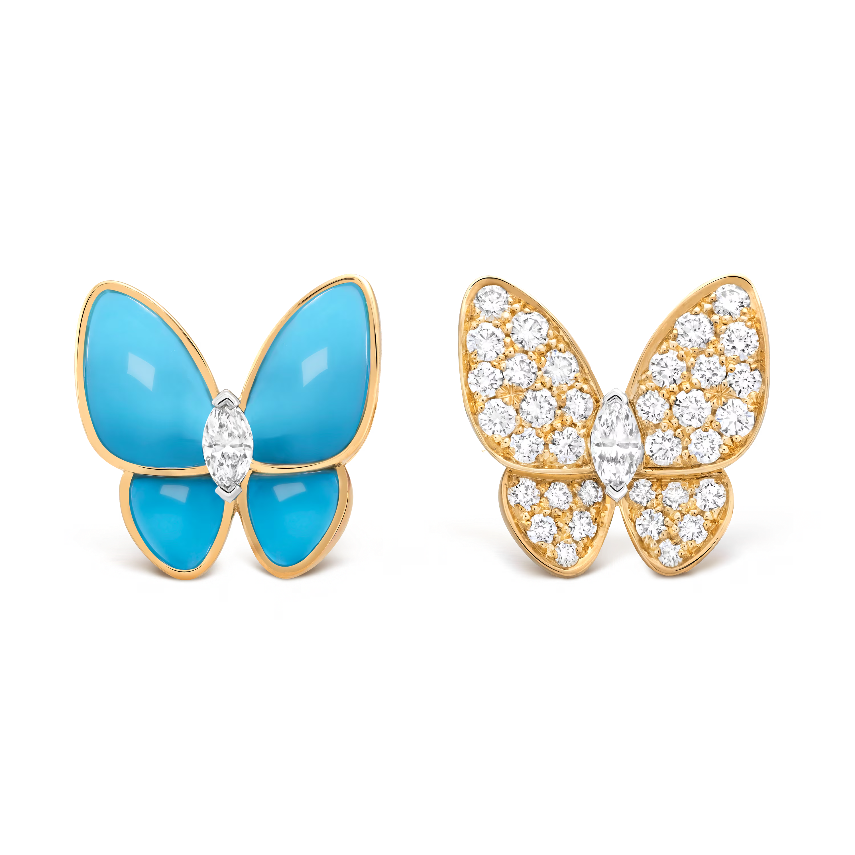 Chaque boucle présente deux papillons en plein vol, disposés avec délicatesse pour évoquer équilibre et élégance naturelle. Réalisés en or 18 carats lumineux et ornés de matériaux naturels tels que nacre, turquoise, onyx ou pierres précieuses colorées (selon la variation), les motifs rayonnent de couleur raffinée et témoignent d’un savoir-faire exceptionnel. Chaque détail — des ailes sculptées aux contours polis — souligne l’engagement de la Maison pour l’art et l’émotion.