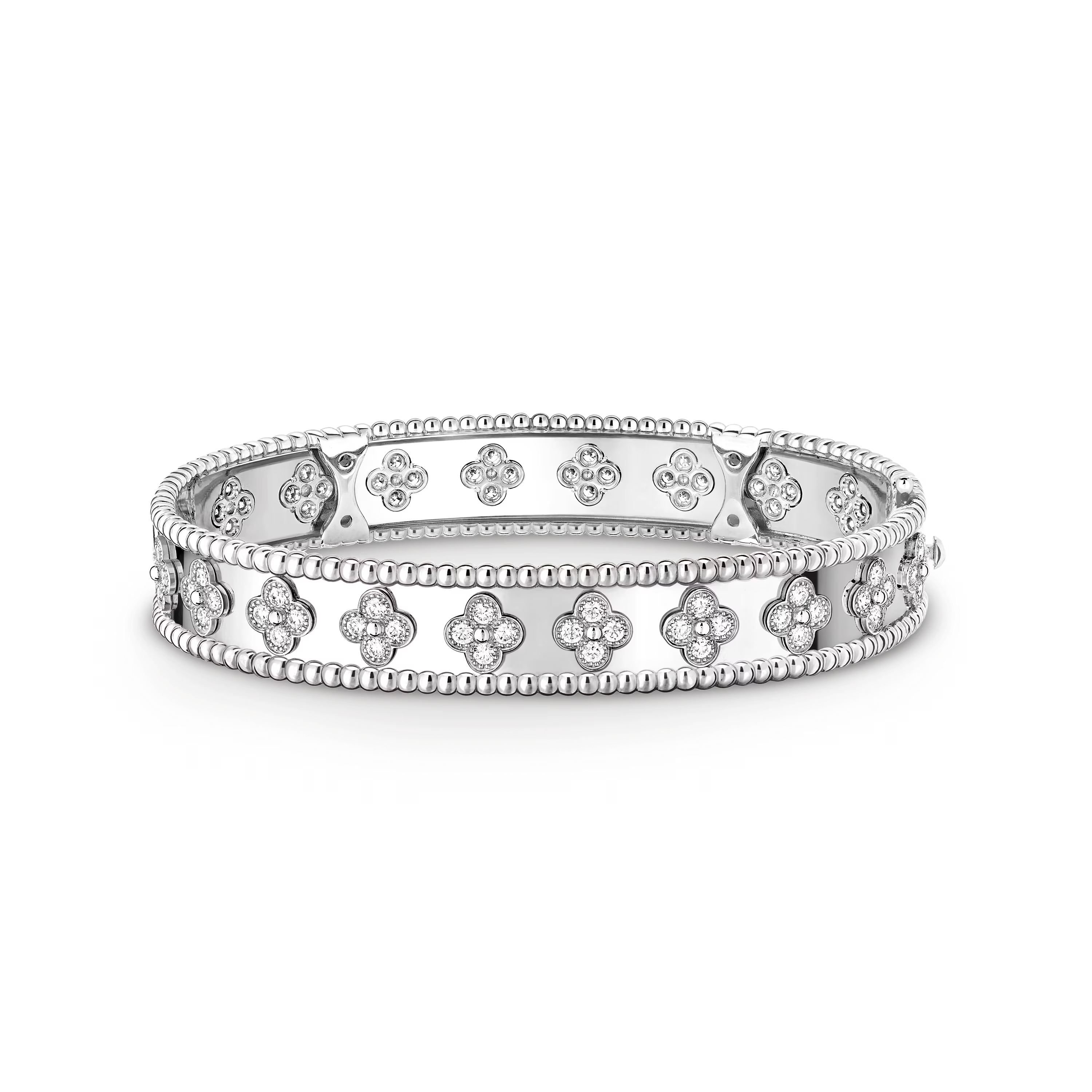 Radieux et expressif, le bracelet Trèfles Perlée incarne une interprétation joyeuse de la chance et de l’élégance, célébrant le mouvement, la lumière et la beauté durable dans une forme contemporaine.