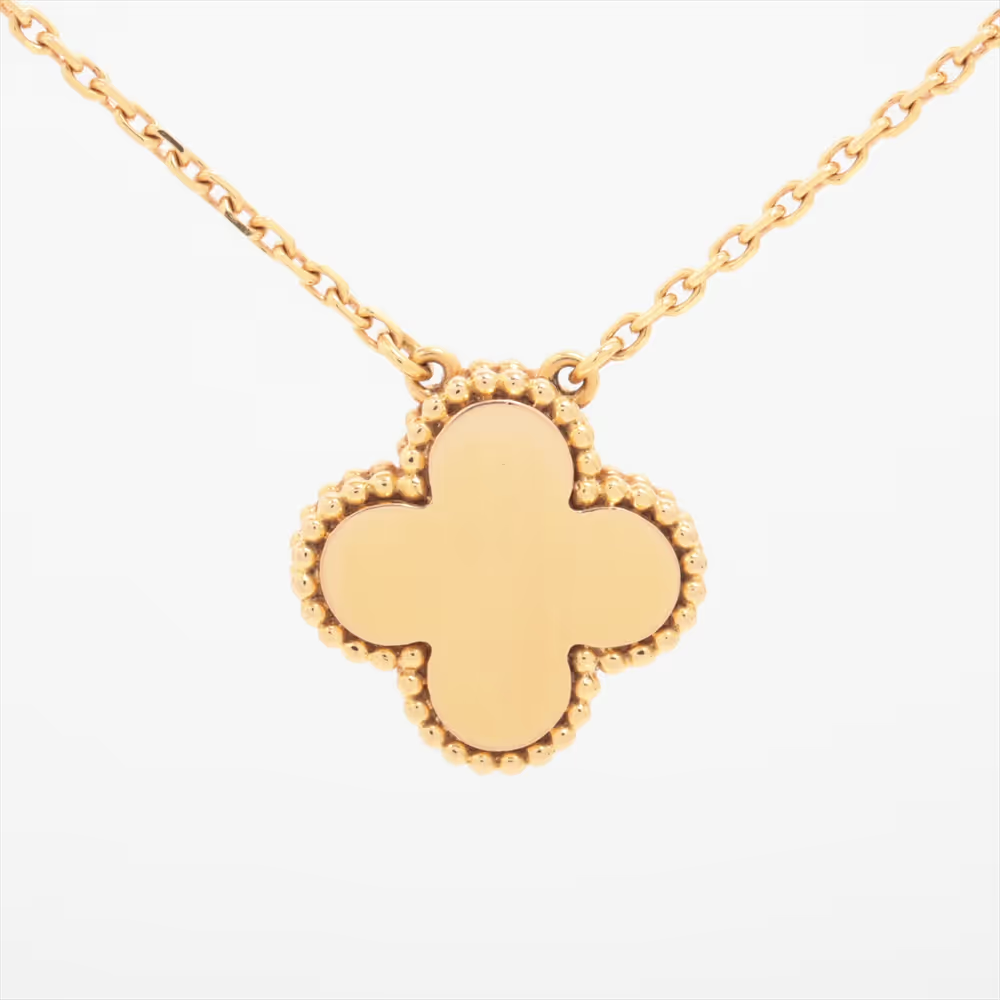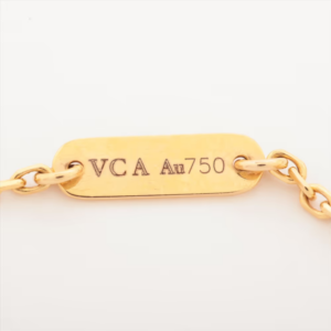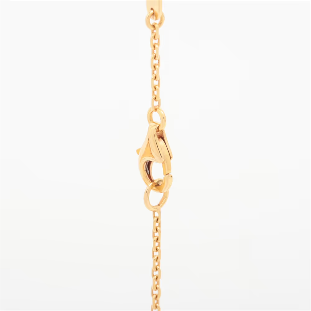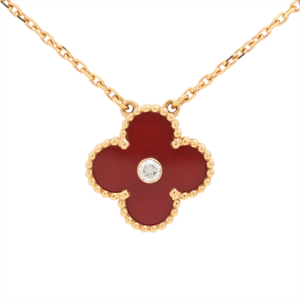 Le collier Van Cleef & Arpels Vintage Alhambra en cornaline et diamants met en valeur le motif emblématique du trèfle à quatre feuilles de la Maison, combinant les tons chaleureux de la cornaline à des accents de diamants scintillants. Réalisé en or 18 carats, chaque motif est encadré par un bord perlée en or, soulignant l’excellence du savoir-faire et le design luxueux.