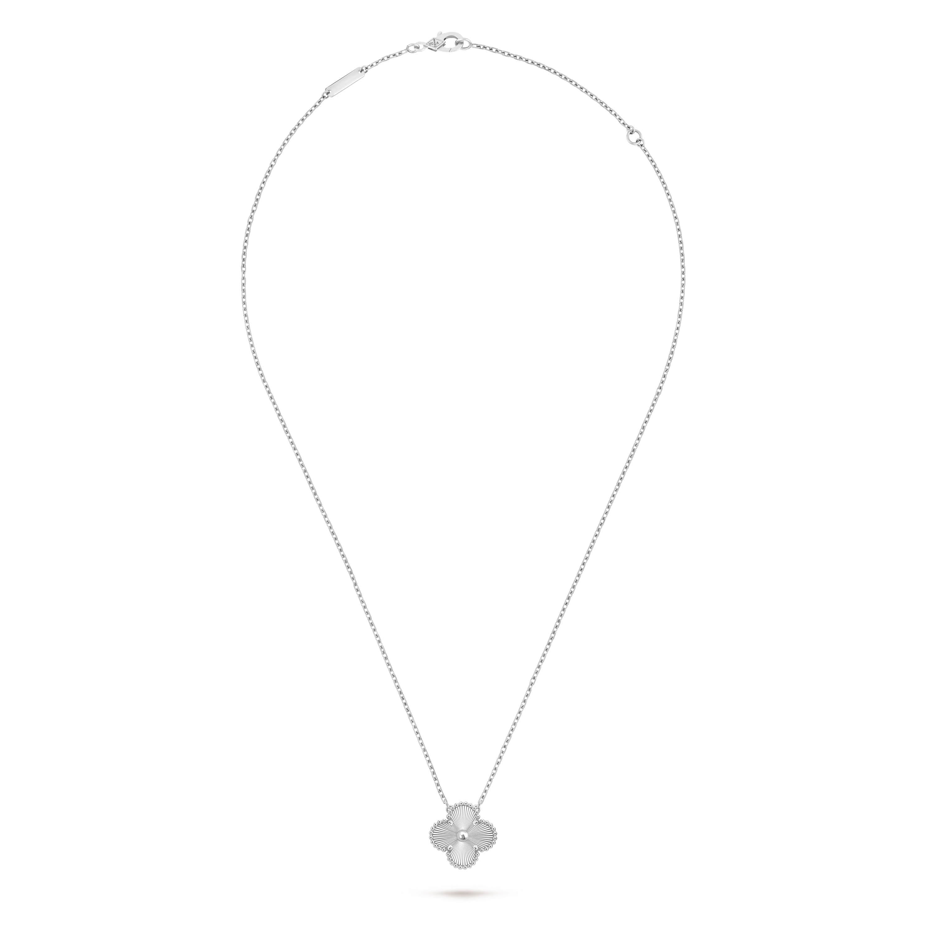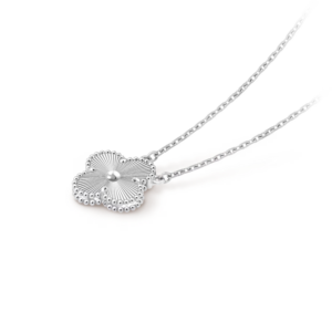 Suspendu à une chaîne assortie en or blanc, le pendentif repose avec élégance le long du décolleté, offrant une touche de luxe discret. Qu’il soit porté seul ou associé à d’autres créations Alhambra, il reste un symbole raffiné d’harmonie et de beauté intemporelle.