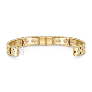 Chaque trèfle est minutieusement réalisé pour révéler des pétales lisses et équilibrés, encadrés par un halo de perles d’or polies. Les contours arrondis ajoutent profondeur et éclat, mettant en valeur la symétrie délicate du motif et conférant au bracelet une luminosité joueuse.