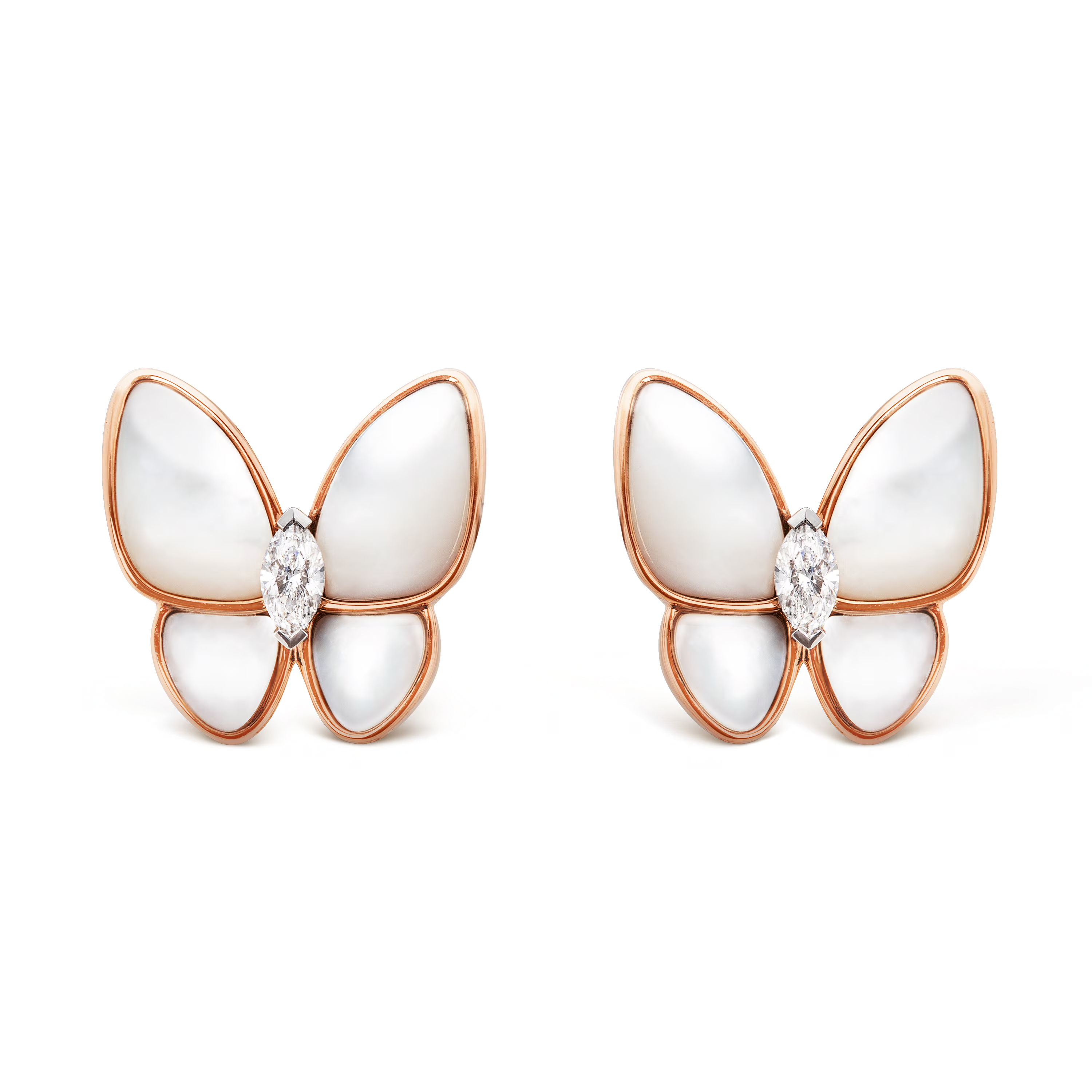 Réalisées en or rose 18 carats, chaque boucle présente deux papillons sertis de diamants taille brillant et incrustés de nacre lumineuse, soigneusement sélectionnée pour son éclat irisé. Les ailes sculptées et les contours en or polis à la main accentuent le jeu de lumière, mettant en valeur le savoir-faire minutieux et l’artisanat de la Maison.