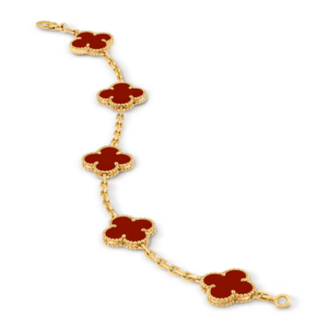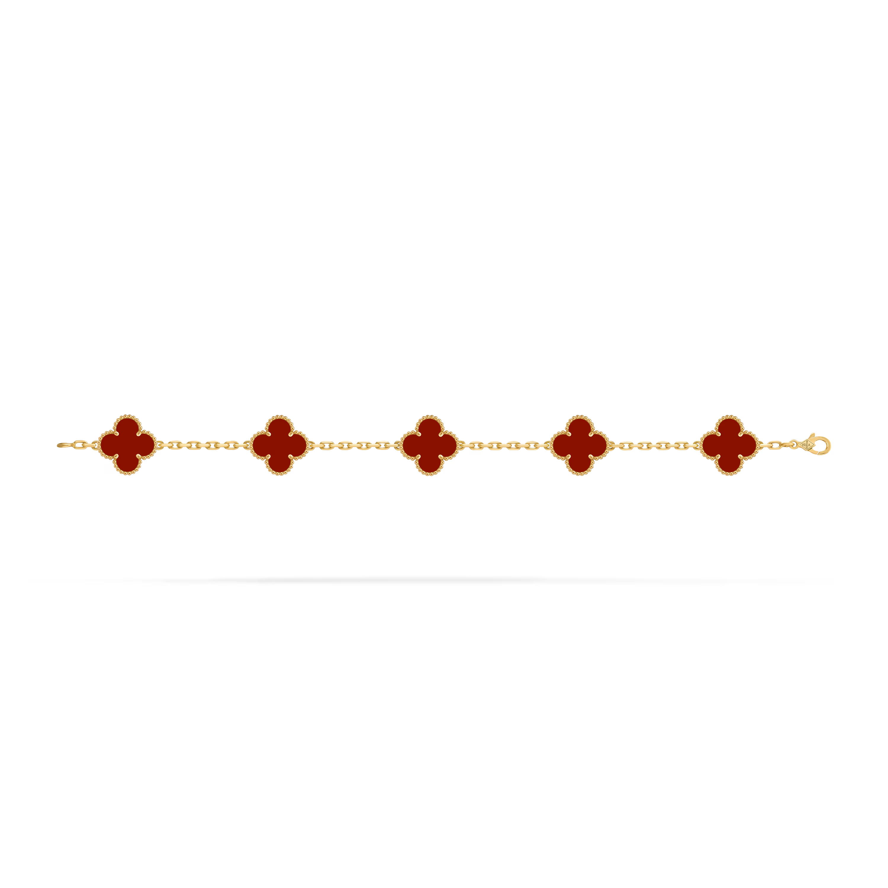 Chaque motif de trèfle à quatre feuilles est souligné par le liseré perlé emblématique de la collection. Ce détail distinctif apporte profondeur, texture et dimension sculpturale, renforçant le caractère immédiatement reconnaissable du bracelet.