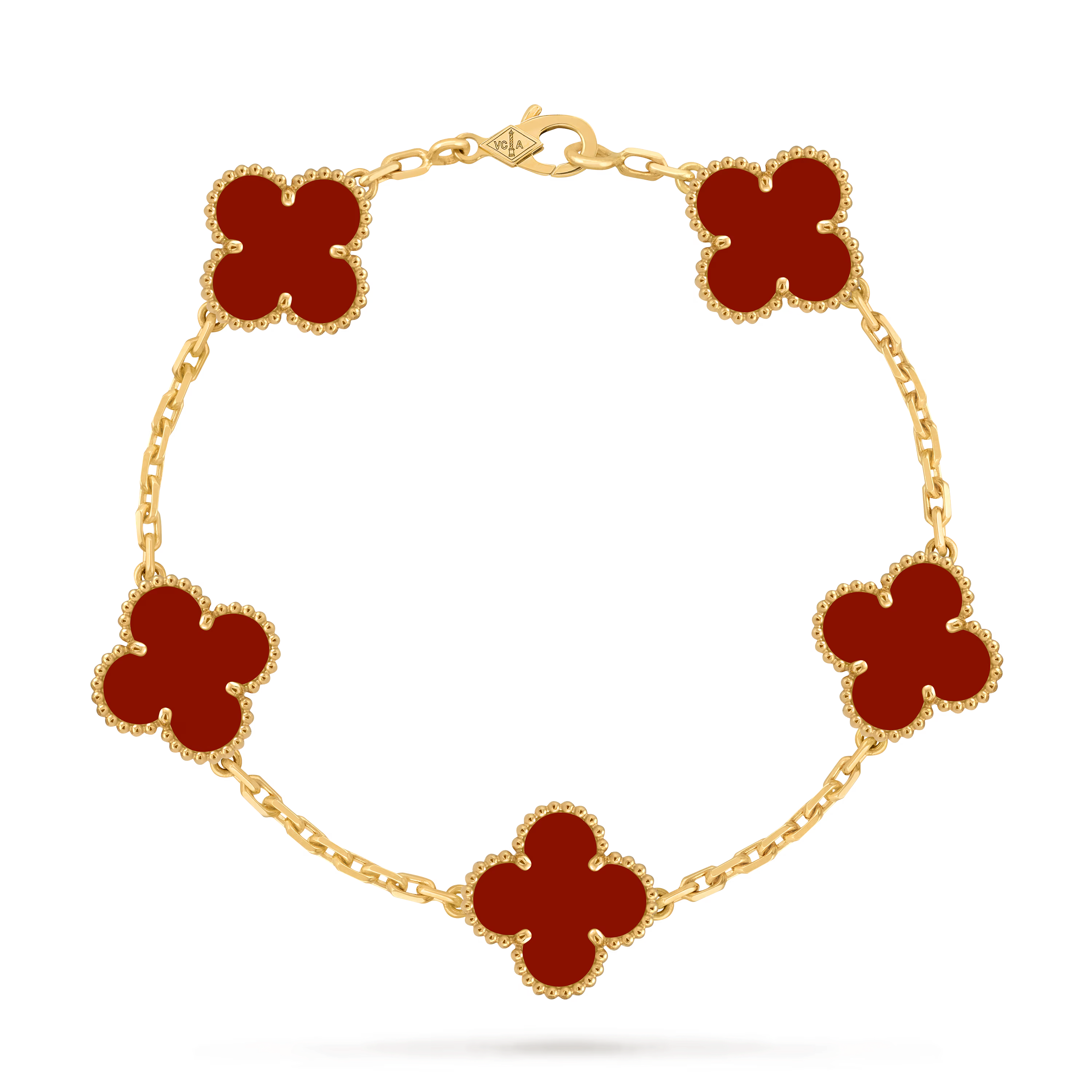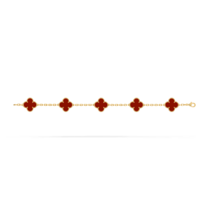 Ce bracelet se compose de cinq motifs Vintage Alhambra, harmonieusement répartis le long de la chaîne. La composition symétrique crée un rythme équilibré et élégant au poignet, mettant en valeur la pureté du design originel.