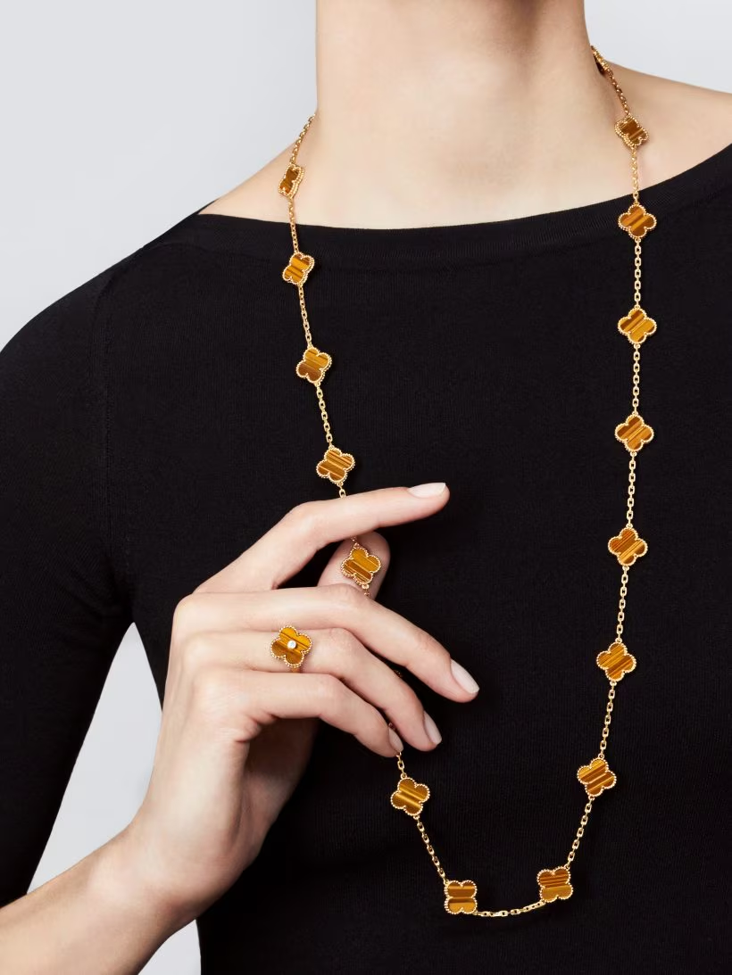 Icône intemporelle de Van Cleef & Arpels, le collier long Vintage Alhambra avec 20 motifs allie savoir-faire raffiné et élégance durable.