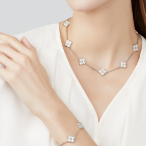 Les diamants sont soigneusement sélectionnés pour leur pureté et leur éclat, mettant en valeur la silhouette raffinée de chaque motif en trèfle. Encadrés par le contour signature de perles d’or, ils captent magnifiquement la lumière, créant un rythme harmonieux le long de la longueur gracieuse du collier. Le design équilibre sophistication et élégance ludique, faisant de ce bijou une pièce polyvalente pour le quotidien ou les occasions spéciales.