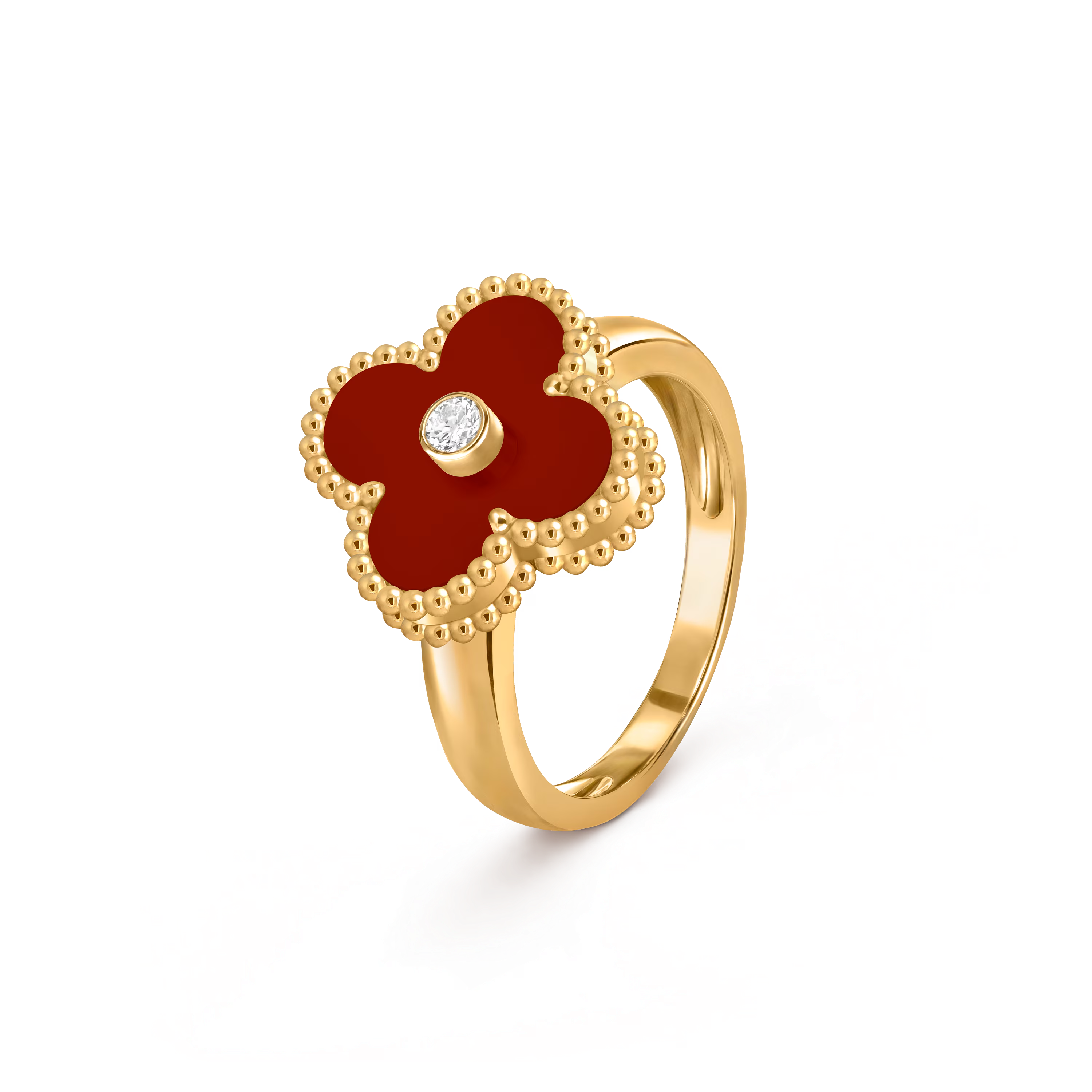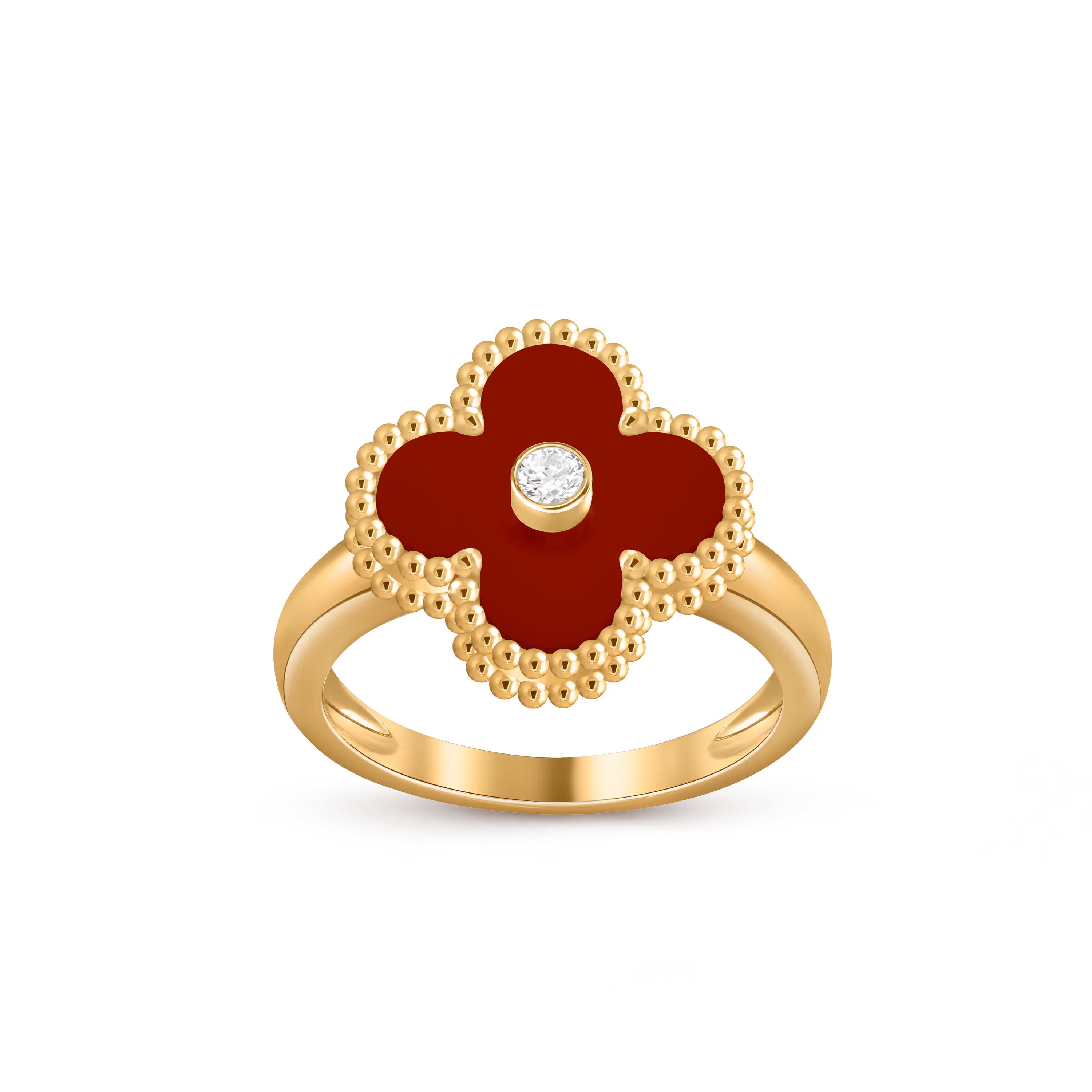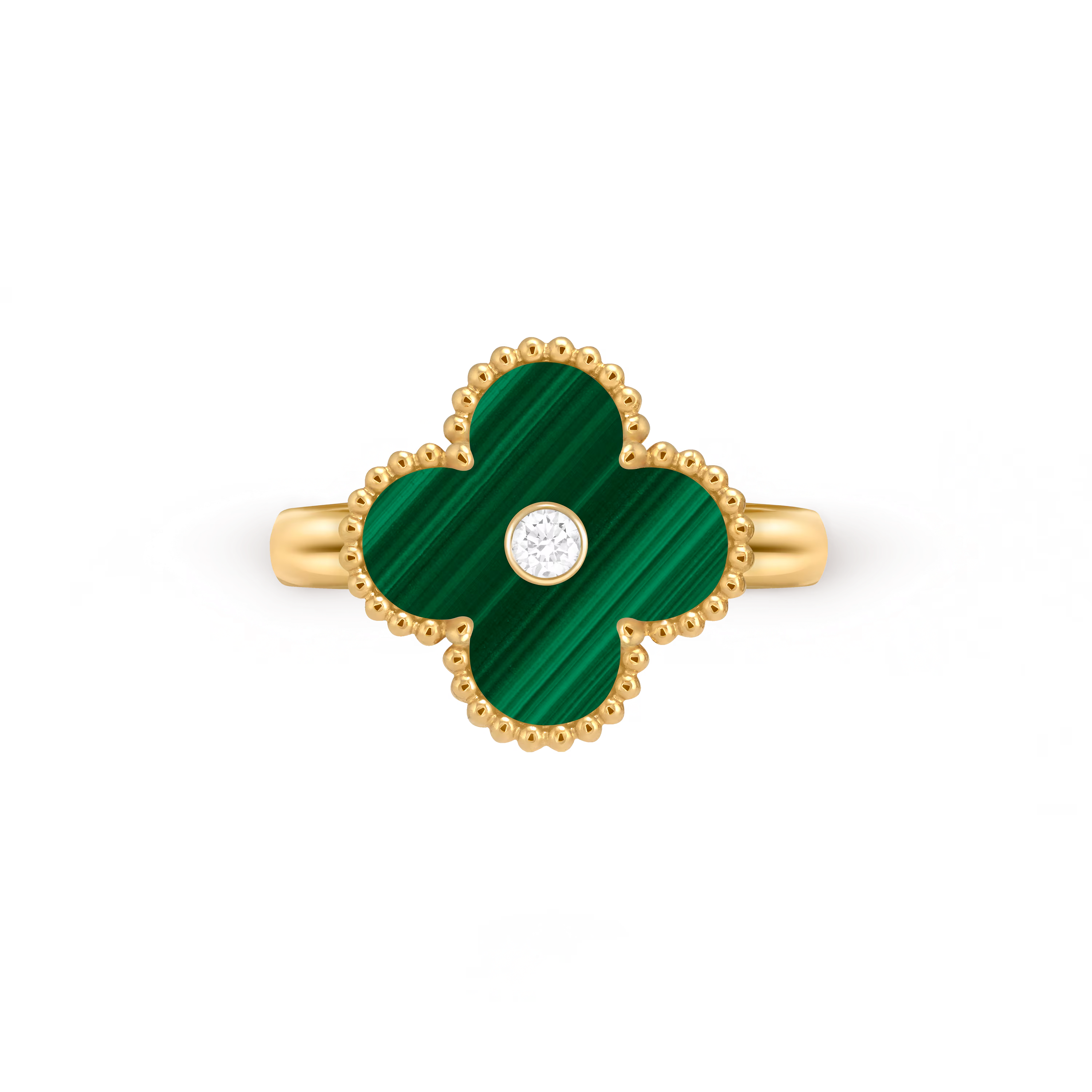 Chaque bague présente le motif Alhambra classique, aux contours polis à la main, captant la lumière avec finesse et apportant un éclat subtil et précieux. Légère et polyvalente, elle peut être portée seule pour une élégance discrète ou associée à d’autres créations Alhambra pour un porté harmonieux et superposé.